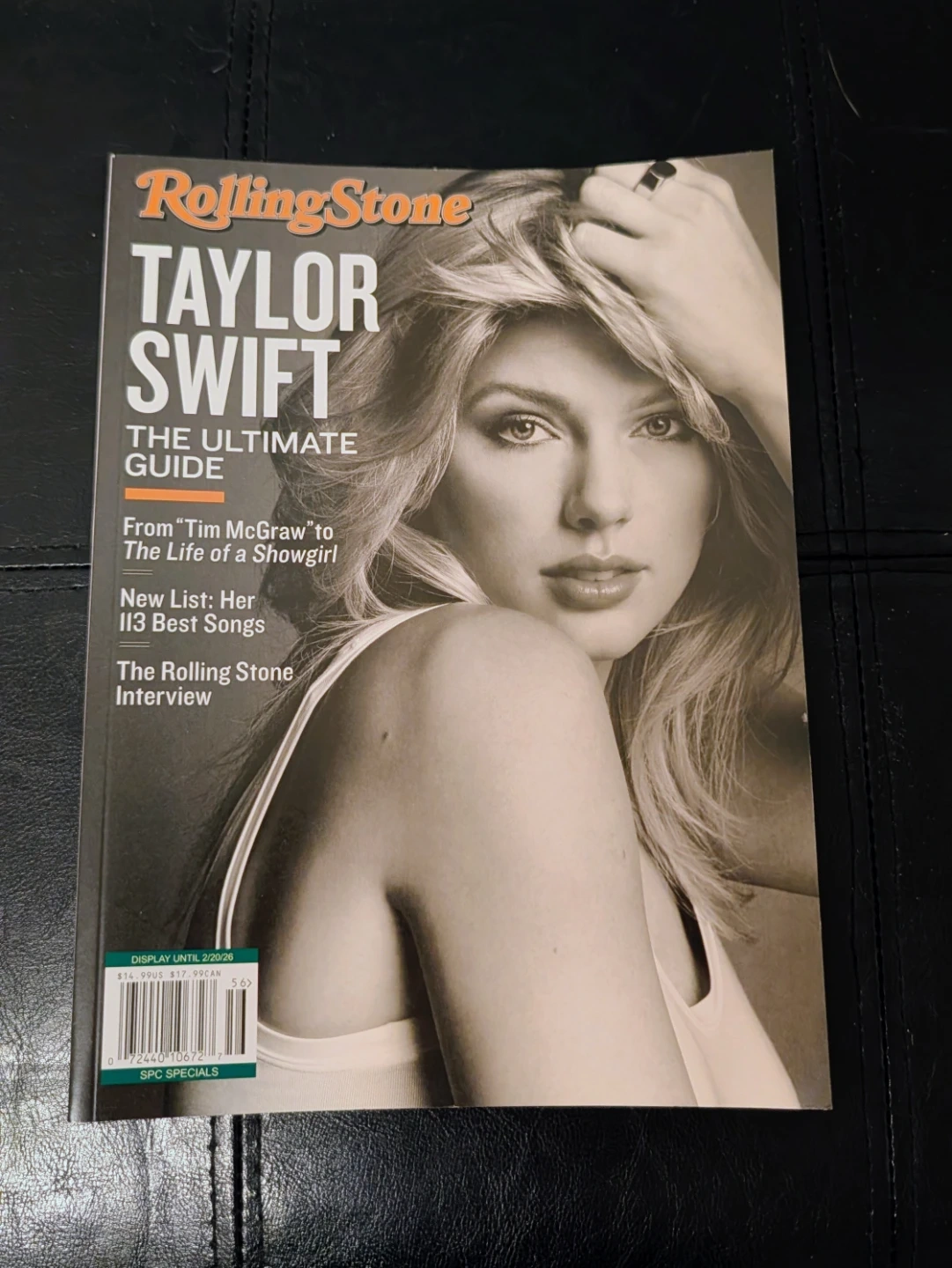 This Rolling Stone magazine features Taylor Swift and is titled 'The Ultimate Guide'. It includes articles like 'From "Tim McGraw" to The Life of a Showgirl' and 'New List: Her 113 Best Songs'. The display until date is 2/20/26.