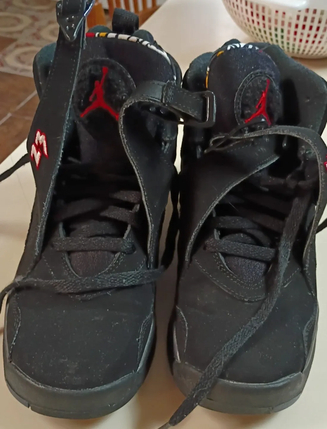These are Air Jordan 8 Retro sneakers in black and red. They feature the iconic Jumpman logo and adjustable straps. Shoes are made with a combination of leather and textile materials.