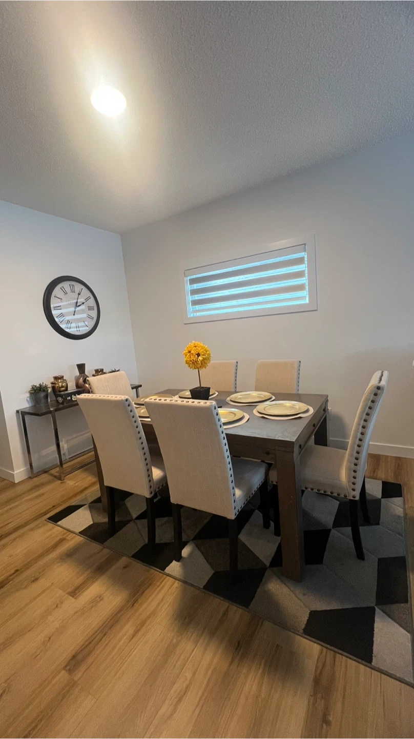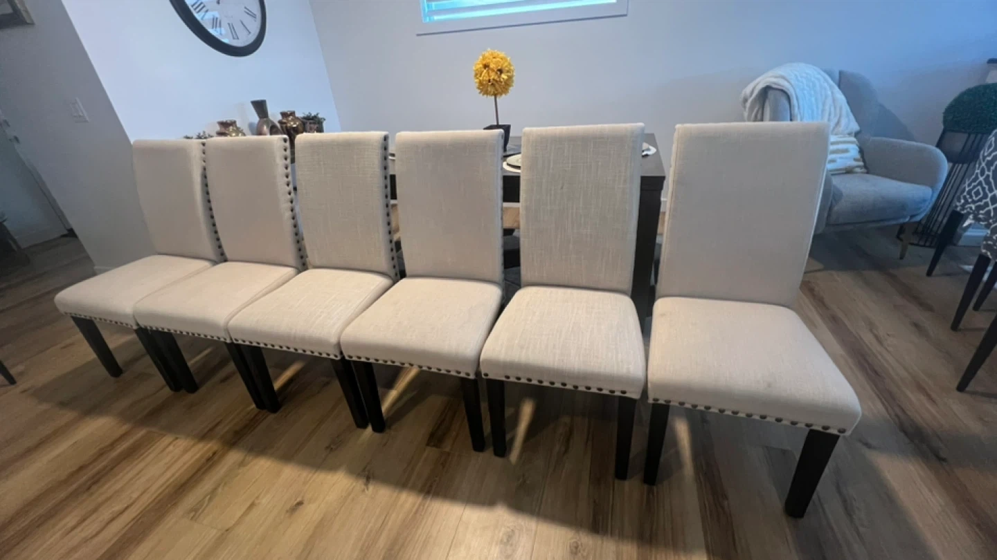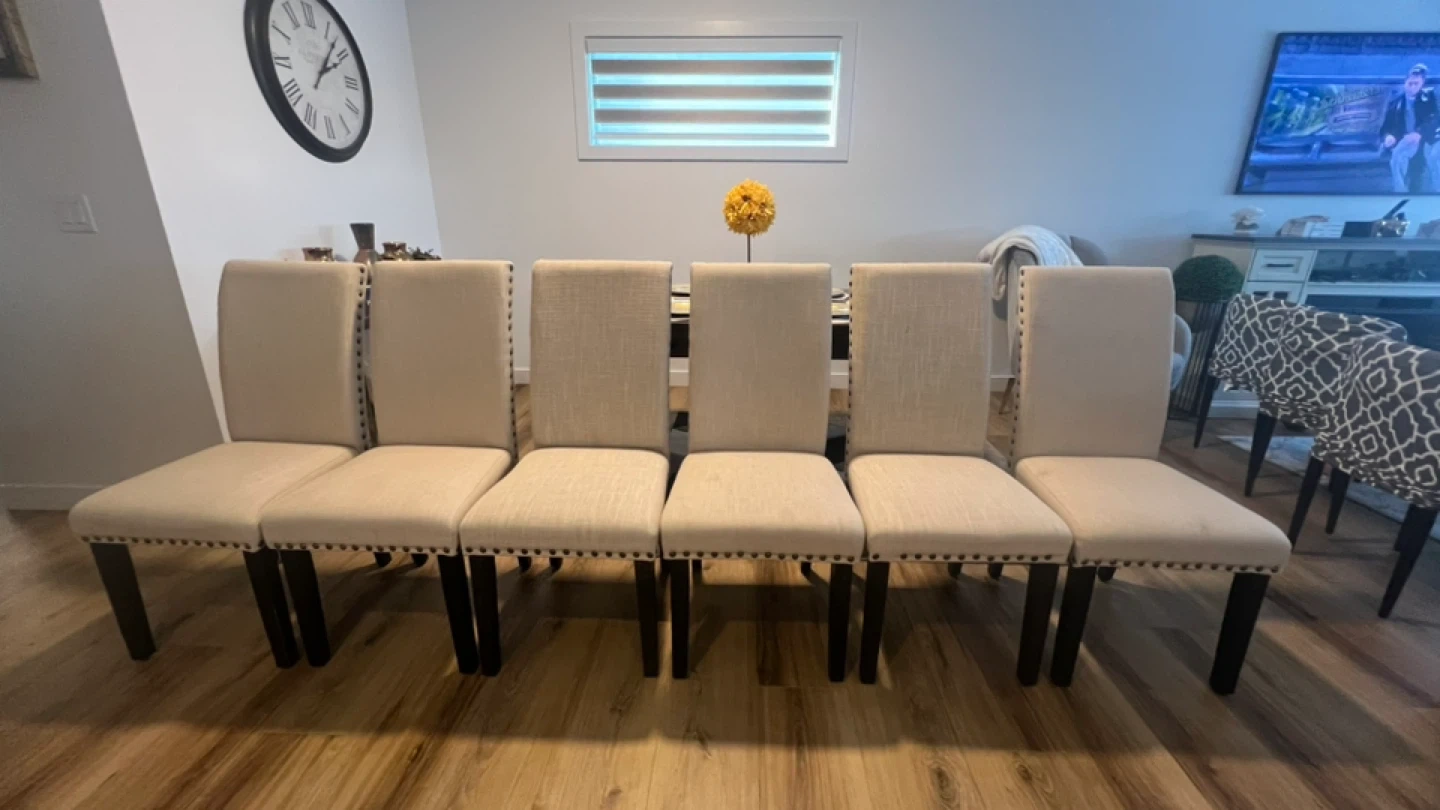 Set of six dining chairs upholstered in a taupe linen-look fabric. Features decorative nailhead trim along the seat and backrest. Dark espresso finished wooden legs provide sturdy support. These chairs would be suitable for a dining room or kitchen area.