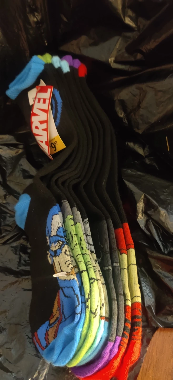 A 5-pair pack of Marvel Avengers themed socks. Size is 8-10. Features characters like Captain America and Hulk.Will not hold for more than 7 days