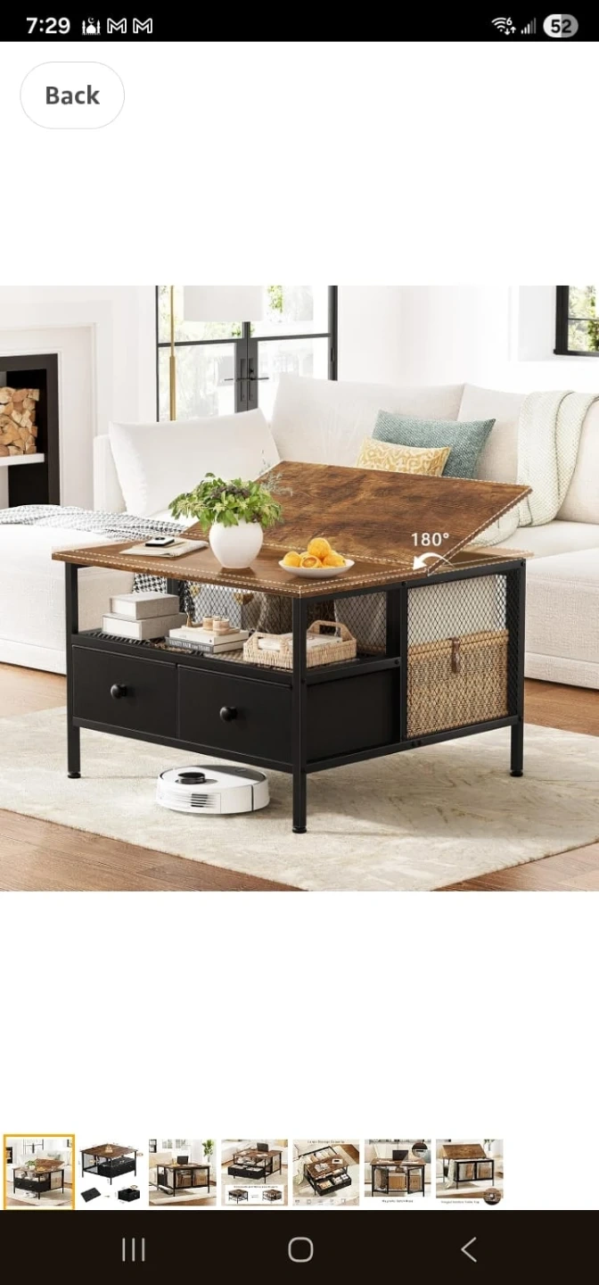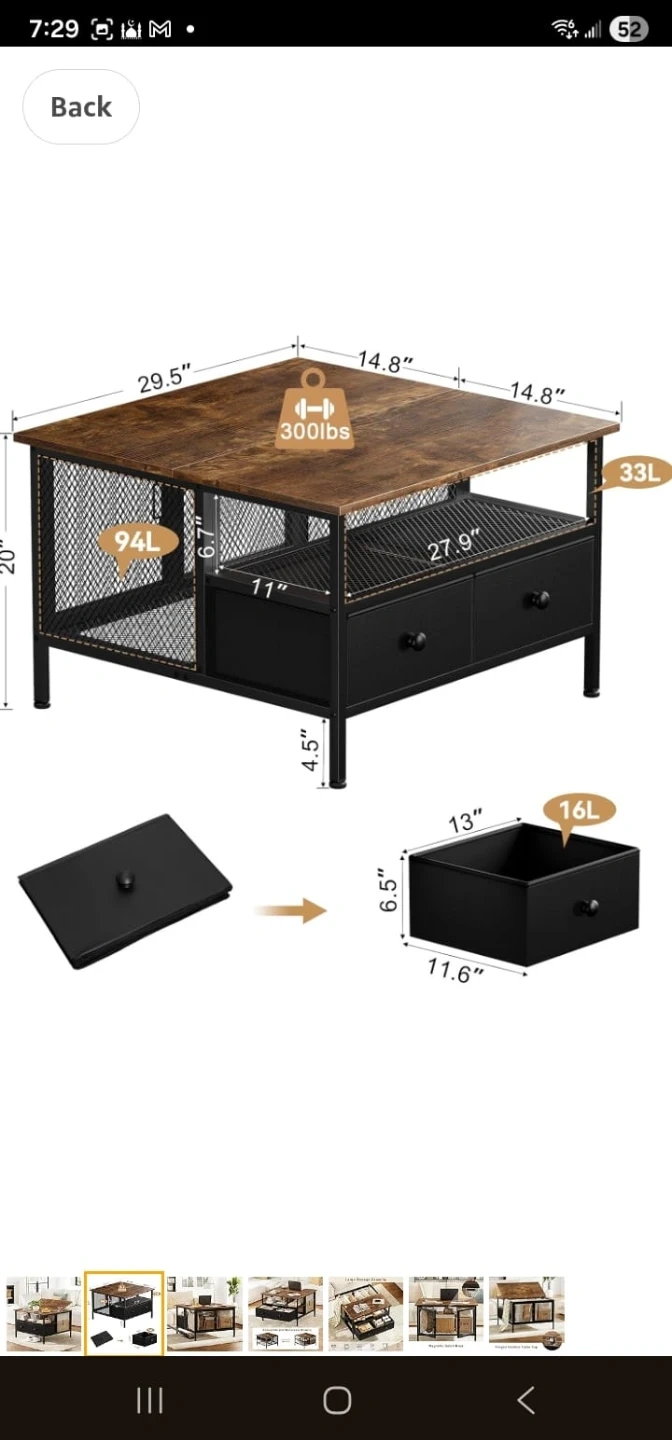 Closed box , never used This coffee table features a lift-top design for easy access to storage. It includes two drawers and a lower shelf with mesh siding for additional storage space. The top surface can be flipped open, revealing a hidden compartment underneath. The overall dimensions are 29.5" W x 20" D x 20" H.