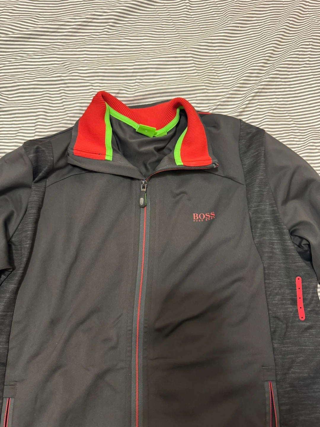 Hugo Boss track jacket in size M! It features a sleek black design with red accents. Perfect for workouts or casual wear. Free delivery within Markham and Scarborough.
