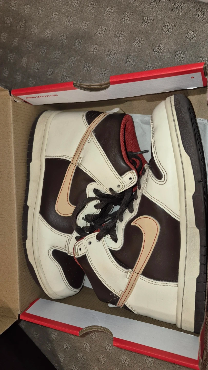 Nike Dunk High sneakers in a brown and cream colourway. These shoes feature a leather upper and rubber sole. Comes with original box.