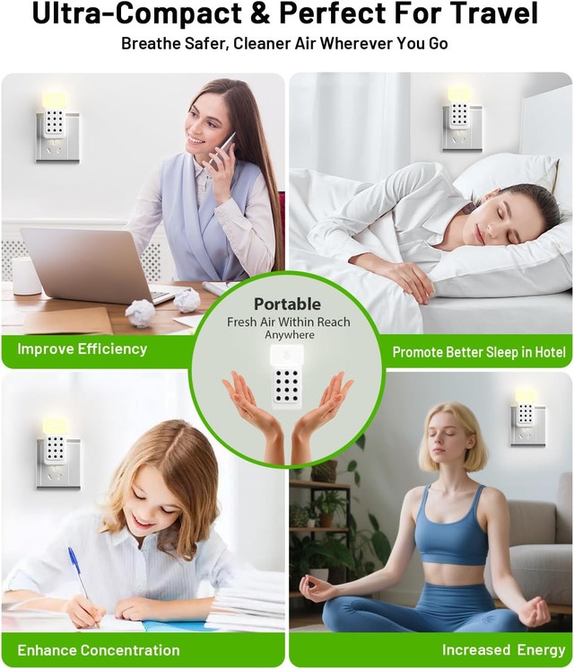 About this item 【Breathe More Fresh Air with Twelve Carbon fiber negative ion heads】ySky Plug in Air Purifer comes with 12pcs carbon fiber Negative ion heads which more powerful and effective.The portable ionizer air purifier adopts anion technology, refreshing indoor air naturally without filters or chemicals: pet smells,other odors from bedroom, bathroom, dining room, living room, and kitchen. Enjoy a relaxing breath of fresh air with peace of mind. 【Quiet 24hrs Operation with Motion Sensor】The plug in air purifiers supports Light Auto- sensing/ always on/always off -three modes optional depends on the environment.A near-silent function and soundless ionic purification run continuously to refresh air. This air purifier works quietly in the background to provide your room or office, with a peaceful environment conducive to rest or concentration.The unique design allows you to always feel the freshness after rain and the warmth of home. 【Filterless and Energy-Efficient safe with ABS fireproof 94V0 material 】As a filterless air purifier,No chemicals, no need to replace filters frequently, no concerns about using in unoccupied spaces only. it provides continuous fresh air for 24 hours with a power consumption of just 2 Watts, making it both sustainable and energy-efficient.and our air purifier is made of ABS fireproof 94V0 material, safer and more reliable than others. 【 Enjoy cleaner air with our filterless air ionizer negative ion generator】An ideal Negative ions Air Purifier to help you clean smells of smoke, pets, cooking, and other unpleasant odors in your home. Because Negative ions will attach to floatings in our daily life. Bid farewell to unpleasant smells and welcome a refreshed home ambiance.making the air in your home as fresh as a forest after rain. 【Convenient Plug in Air Ionizers for Home】The air purifiers comes with compact and Unique design,making the wall plug air purifier simple for anyone to operate.The ionic air purifier is Mini (2*2.3*3.86inch), light weight(3oz). Take it with you on the go, plug and play, save space and replace bulky, expensive air purifiers.Just plug ySky air ionizers into any standard outlet will automatically start releasing negative ions to fresh the air. 【2 in1 ionizer air purifier for home】:The plug in air purifier has a built-in motion sensor and 3 modes optional. "On" mode - always on; "Off" mode - always off; "Motion sensor Auto" mode - automatically turns on when motion is detected in the dark and turns off after 15seconds of inactivity.