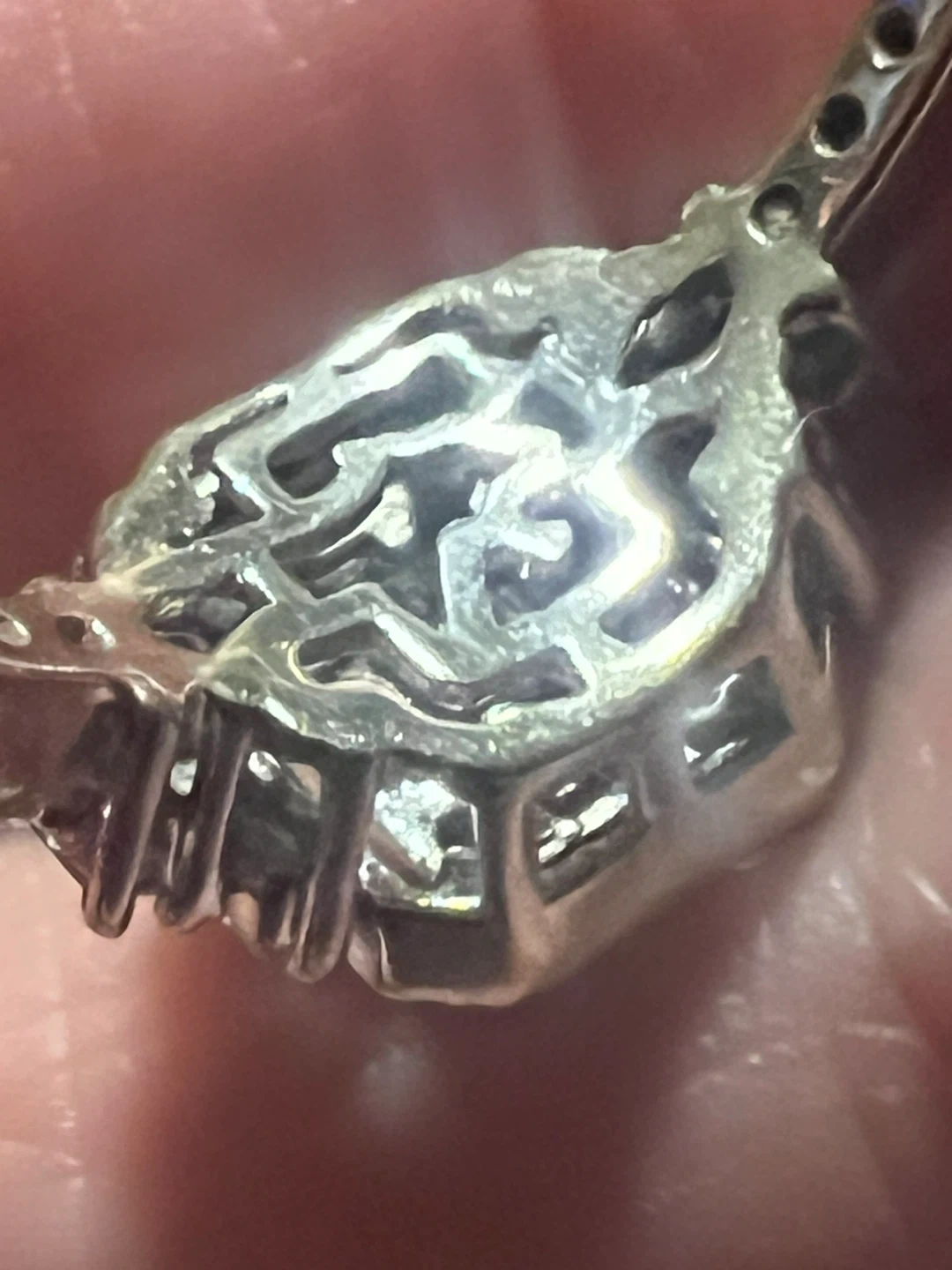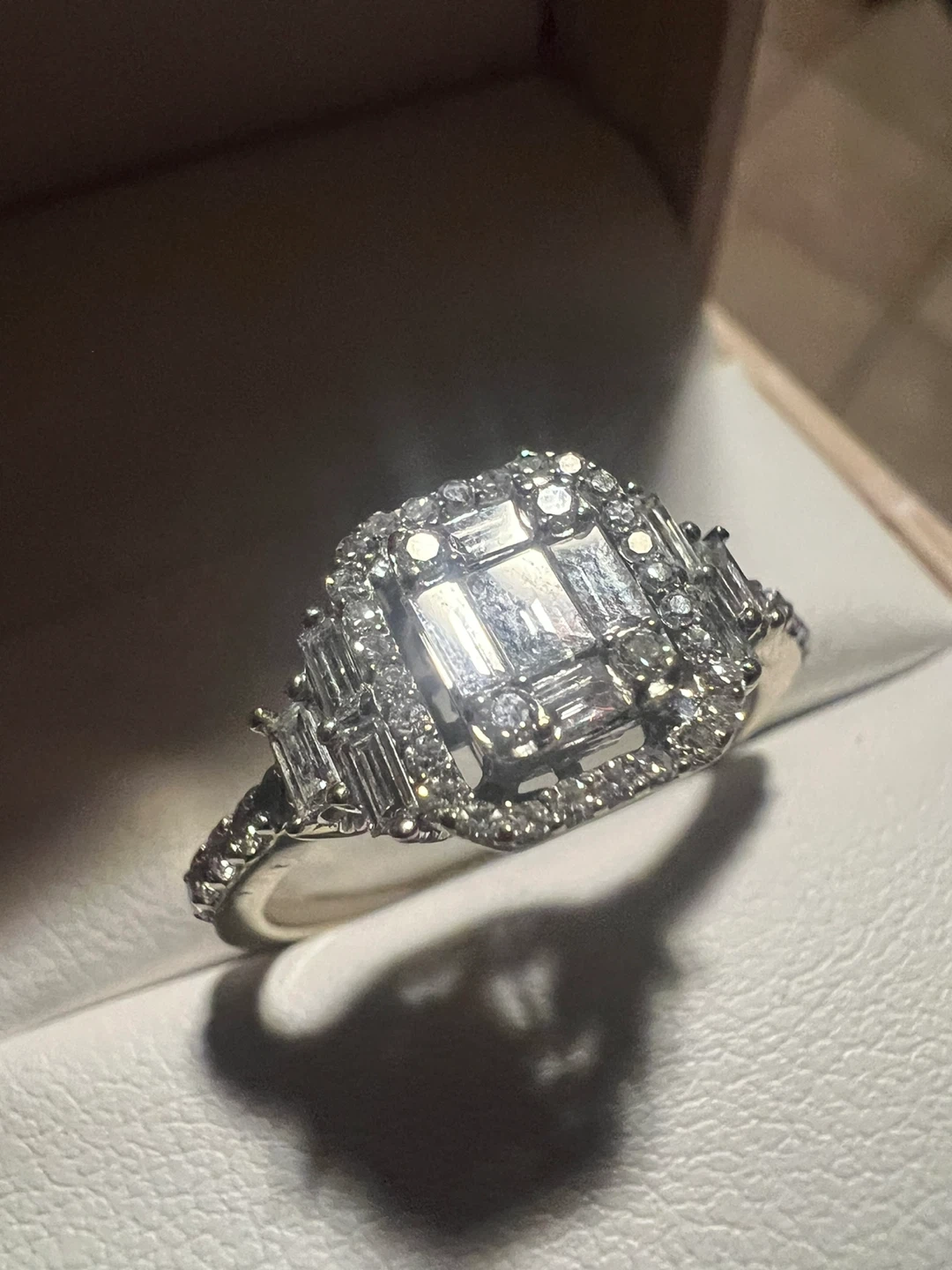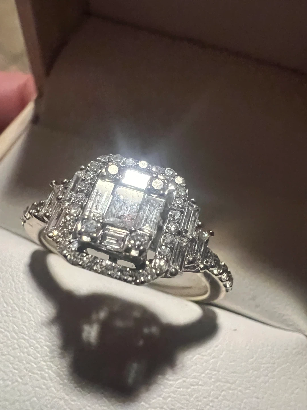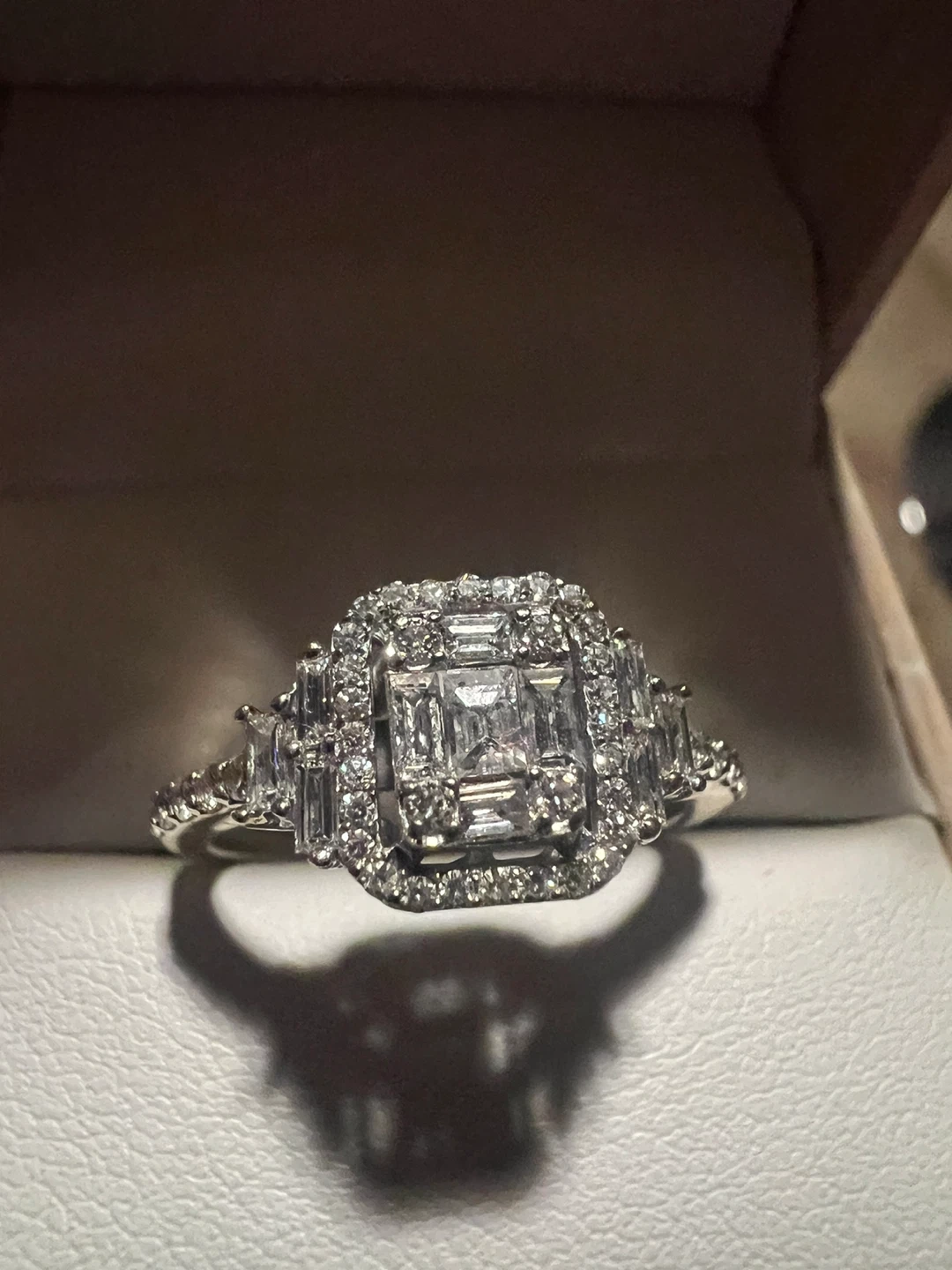 Beautiful 14 k diamond engagement ring with a square-cut center stone surrounded by smaller baguette and round diamonds. Crafted from white gold, it features an intricate setting with a halo design. This ring's sparkle is sure to impress!