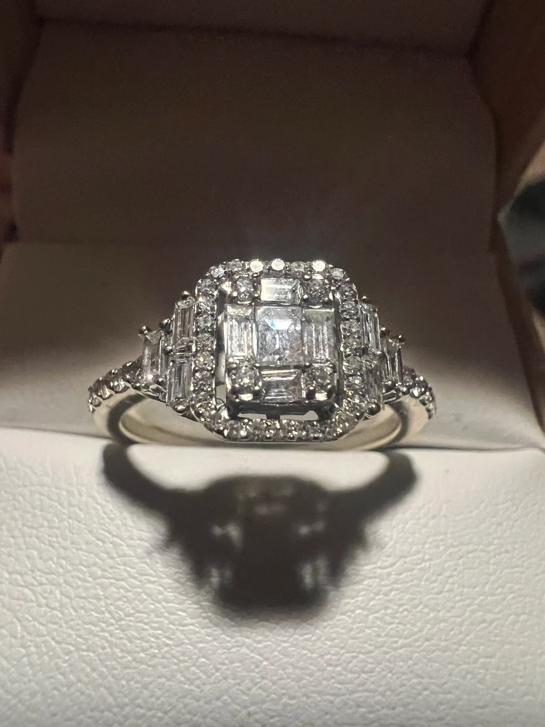 Beautiful 14 k diamond engagement ring with a square-cut center stone surrounded by smaller baguette and round diamonds. Crafted from white gold, it features an intricate setting with a halo design. This ring's sparkle is sure to impress!