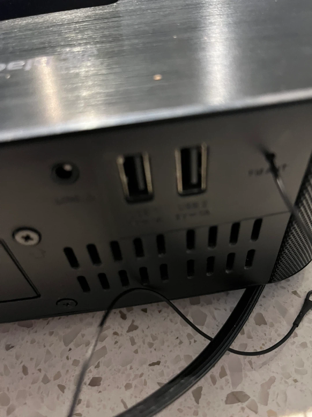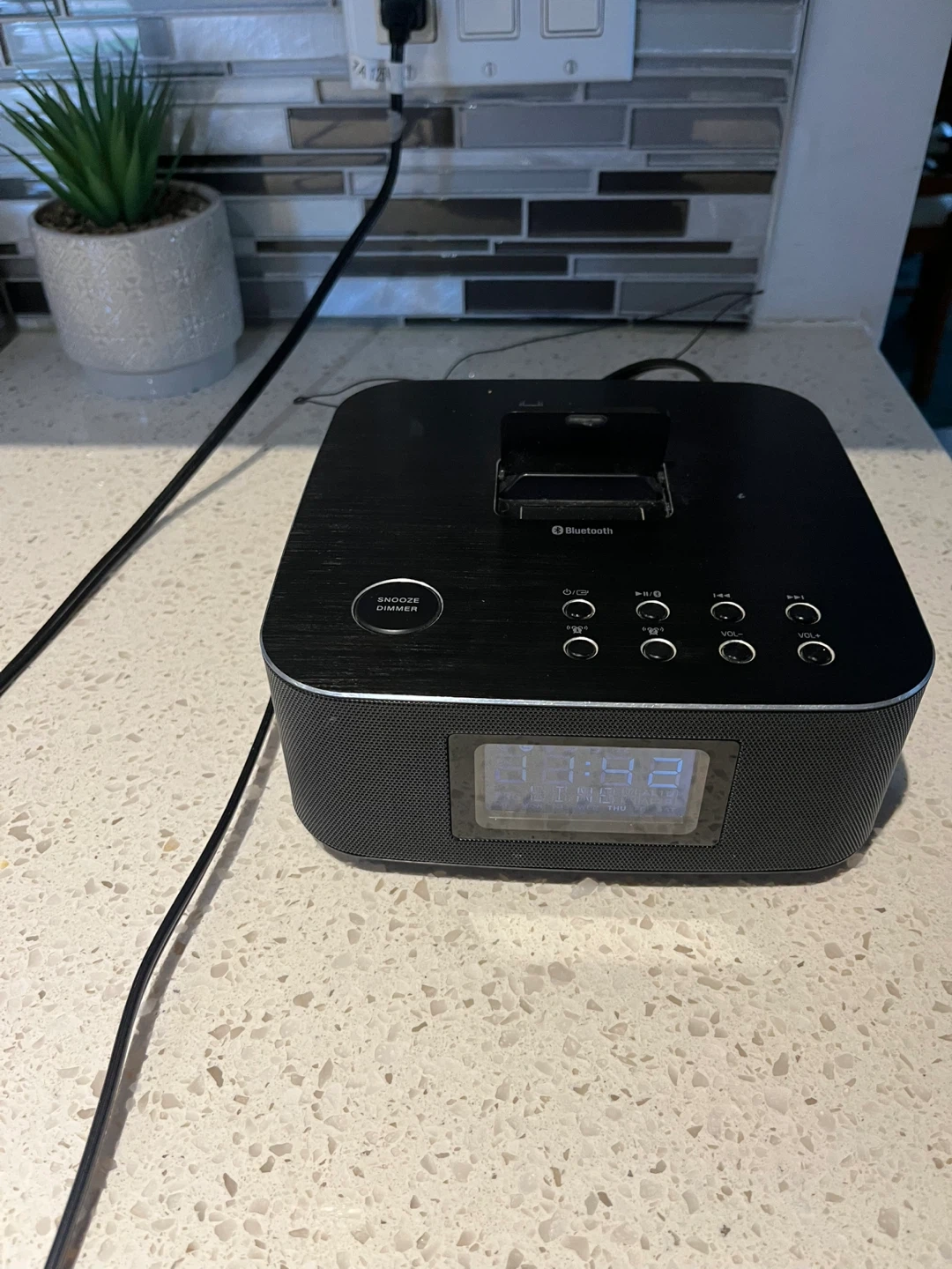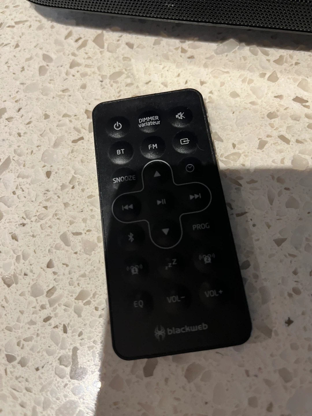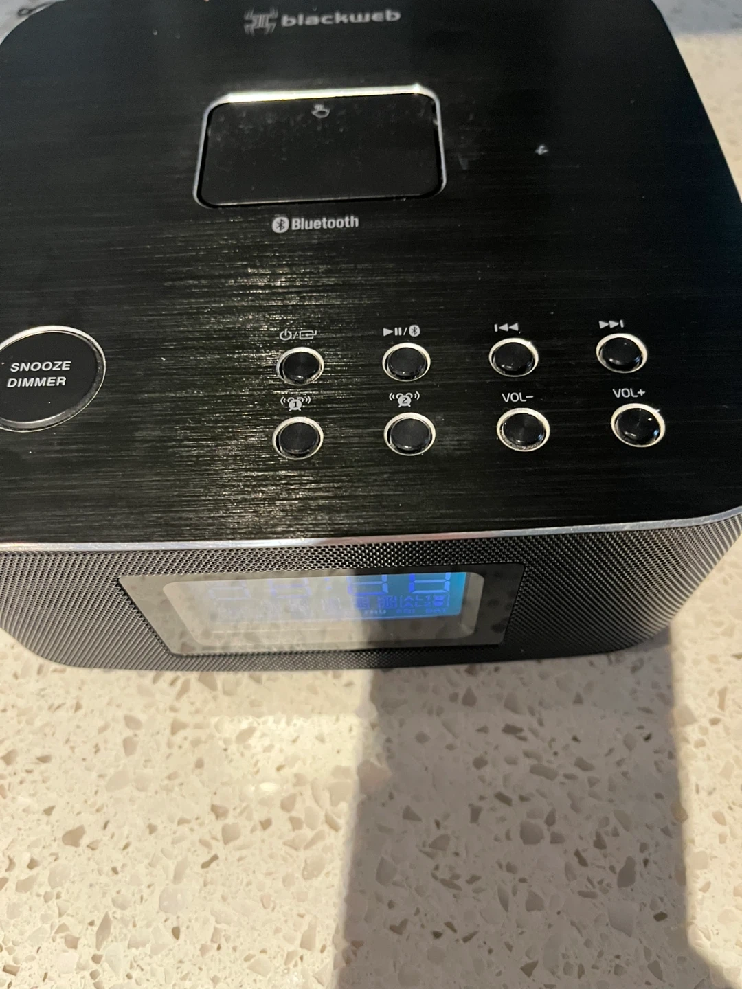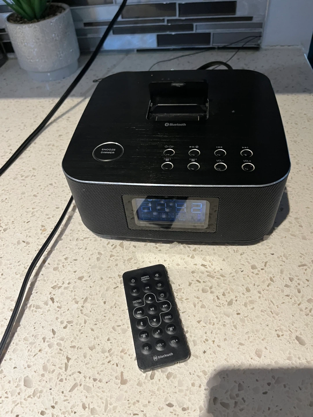 This is a black Blackweb clock radio that features Bluetooth connectivity. It includes a remote control for easy operation. It has a USB port for charging or playback and a line-in port.