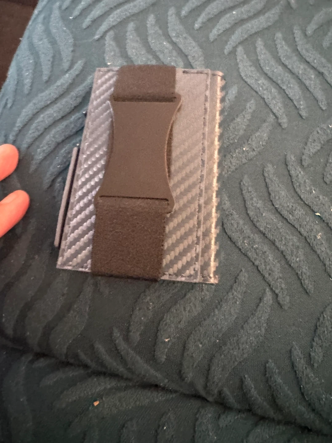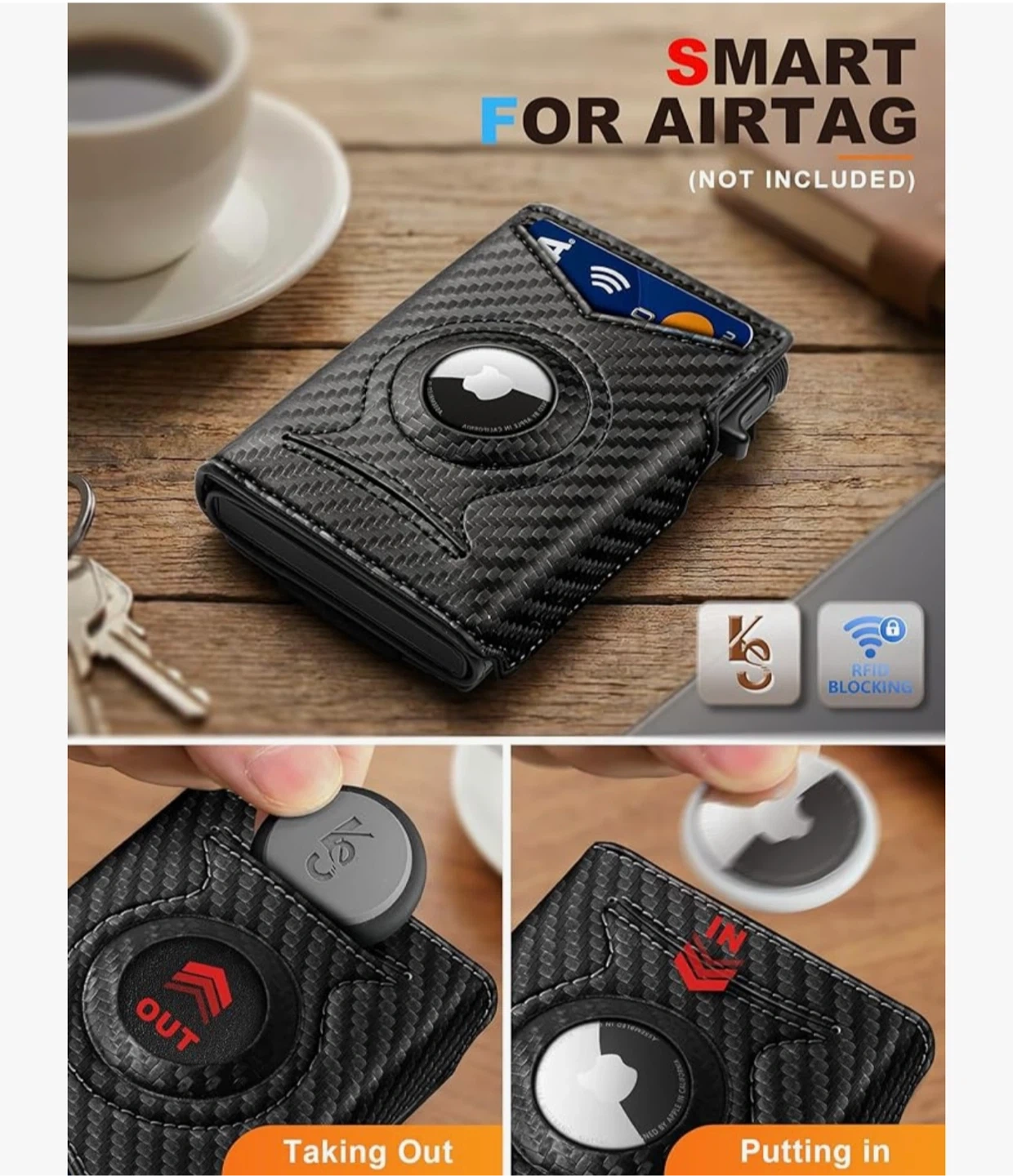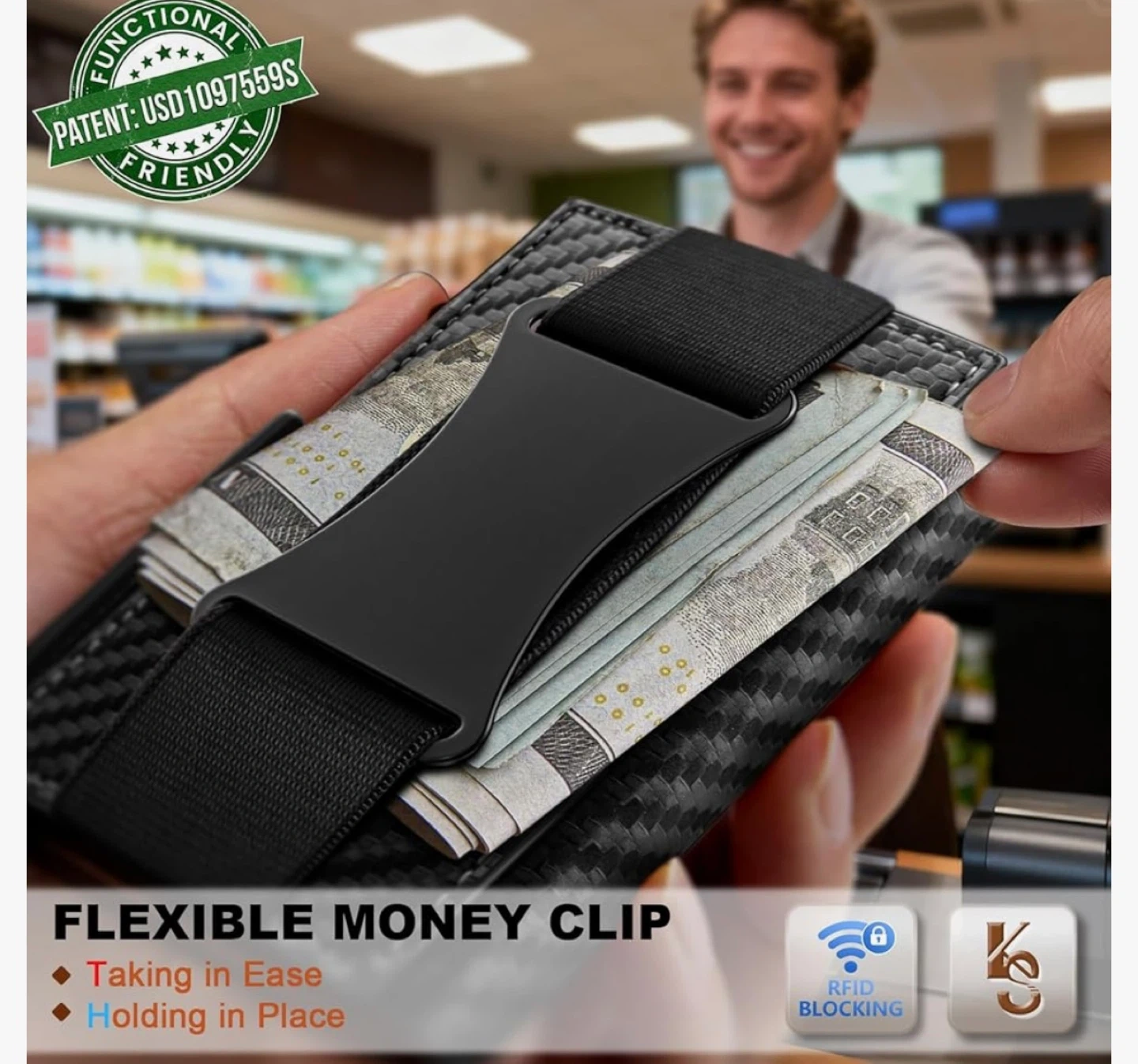 This carbon fiber wallet offers RFID blocking protection for your cards. It features a flexible money clip to hold your bills securely. It's designed to be compact and functional.