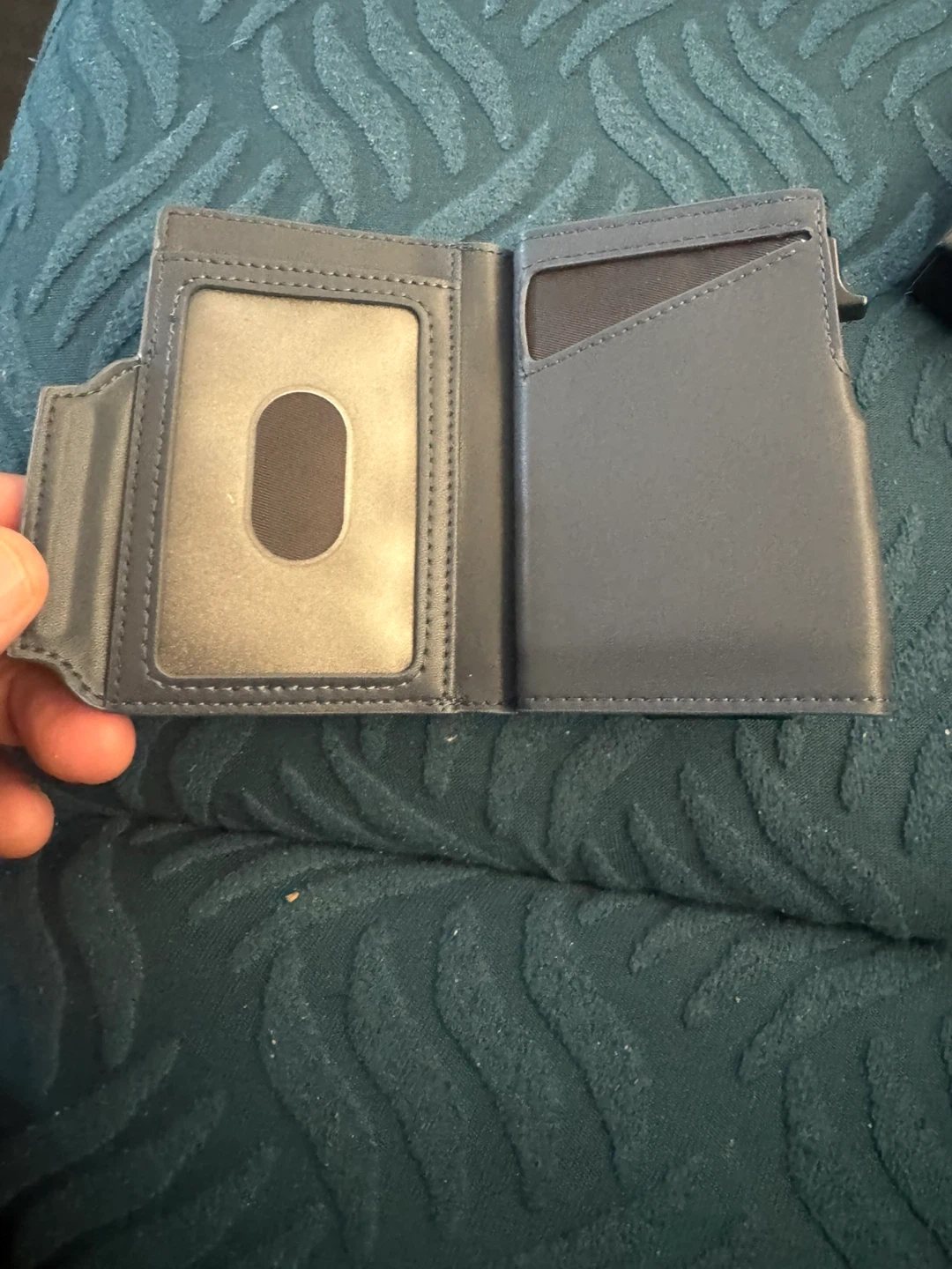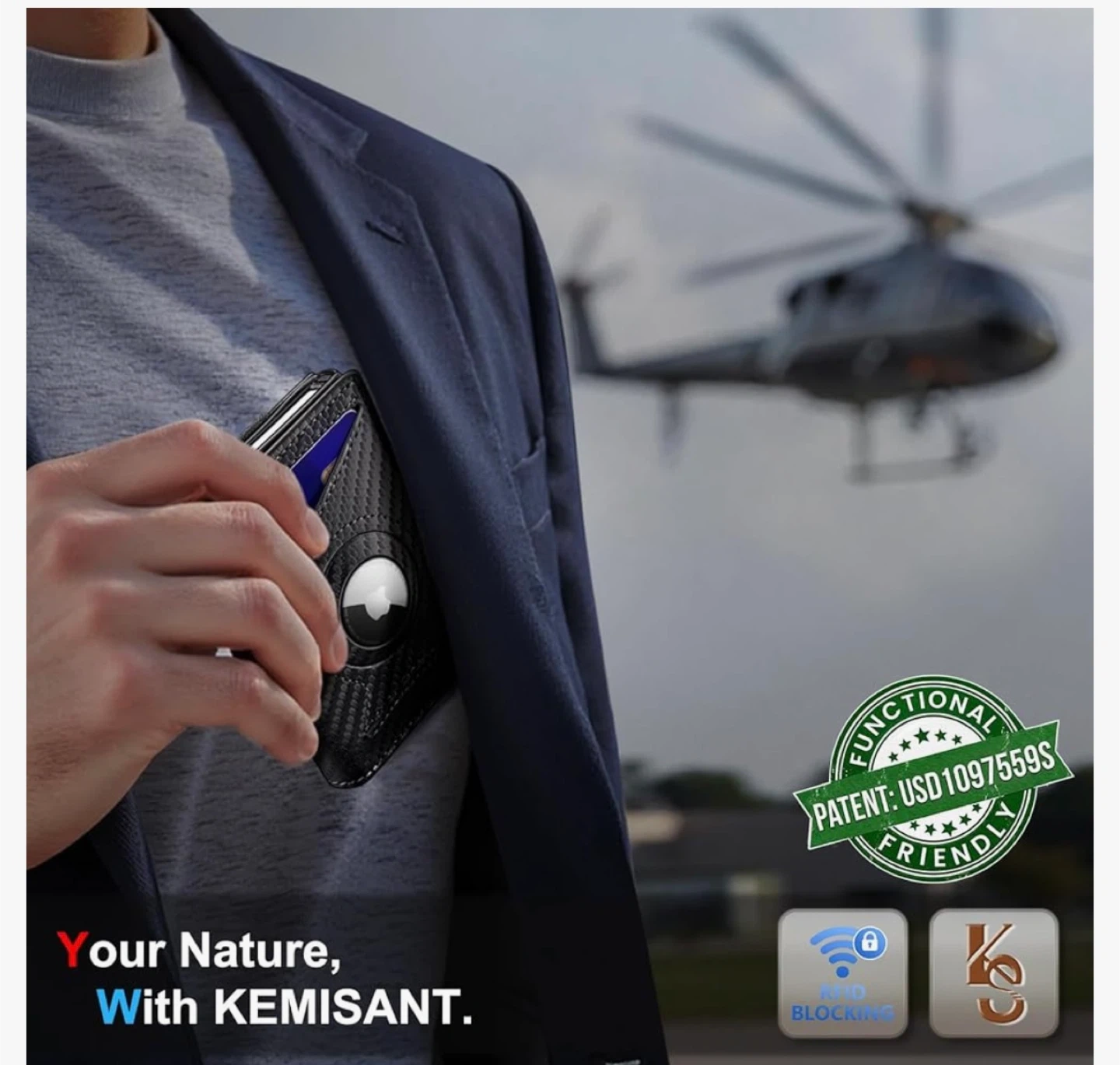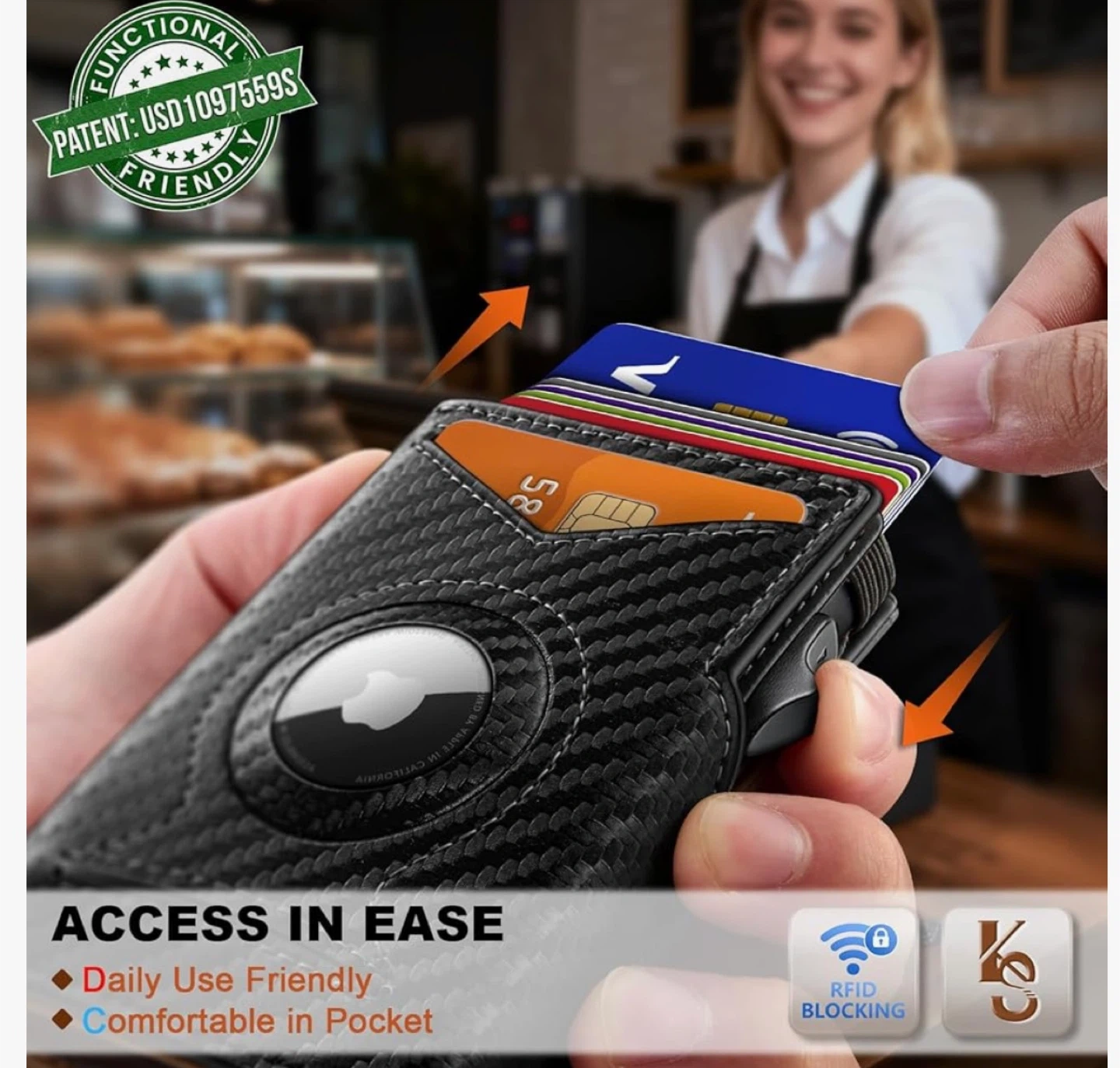 This carbon fiber wallet offers RFID blocking protection for your cards. It features a flexible money clip to hold your bills securely. It's designed to be compact and functional.