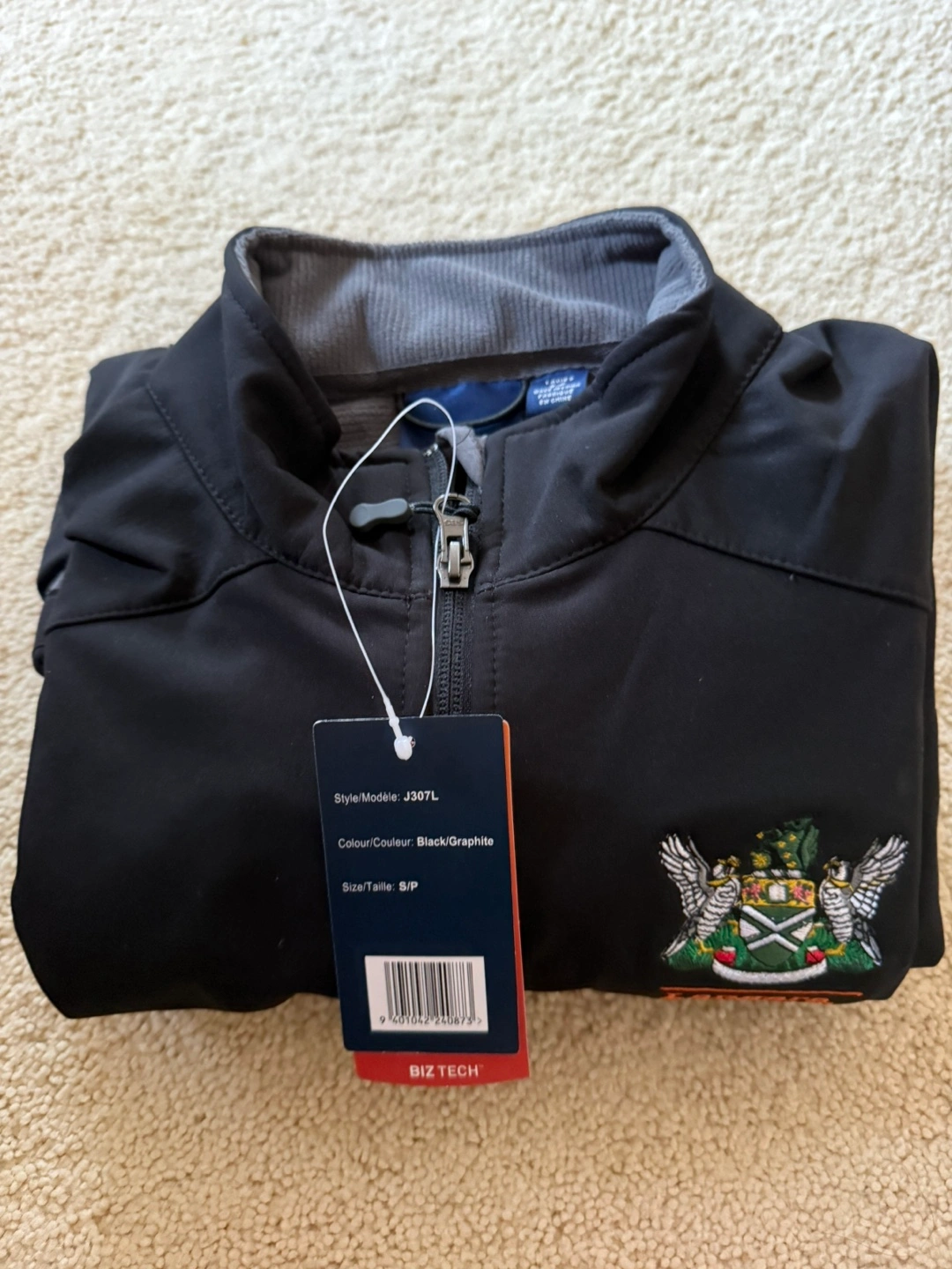 This black jacket is perfect for those breezy fall days. It is a small size, with a zipper closure. There are two zippered pockets. The jacket includes a small embroidered crest on the front.