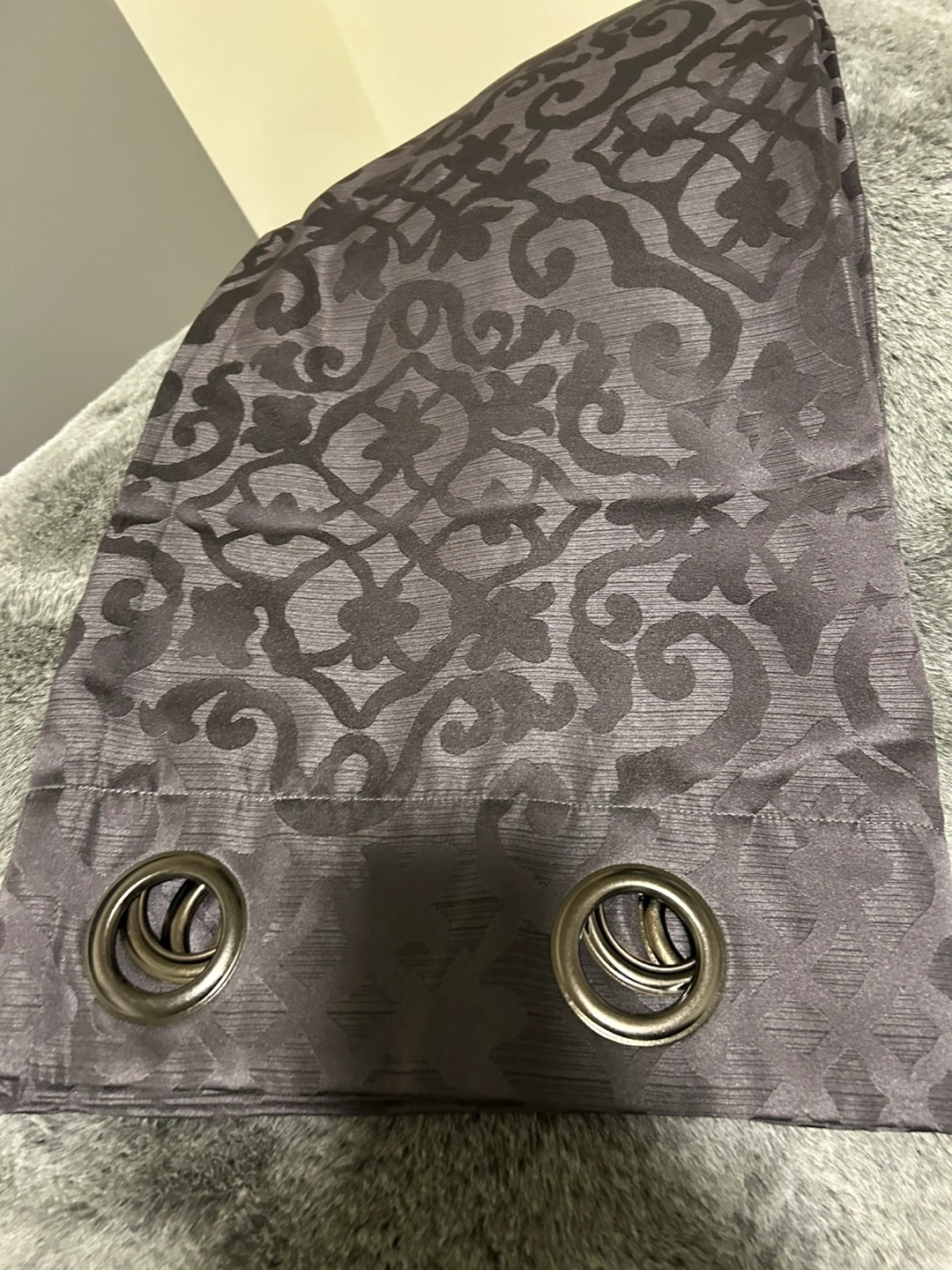 2 grey curtains have a damask-like pattern woven into the fabric. They're made of 100% polyester and are washable. The grommets make them easy to hang. These curtains are suitable for most living rooms or bedrooms.