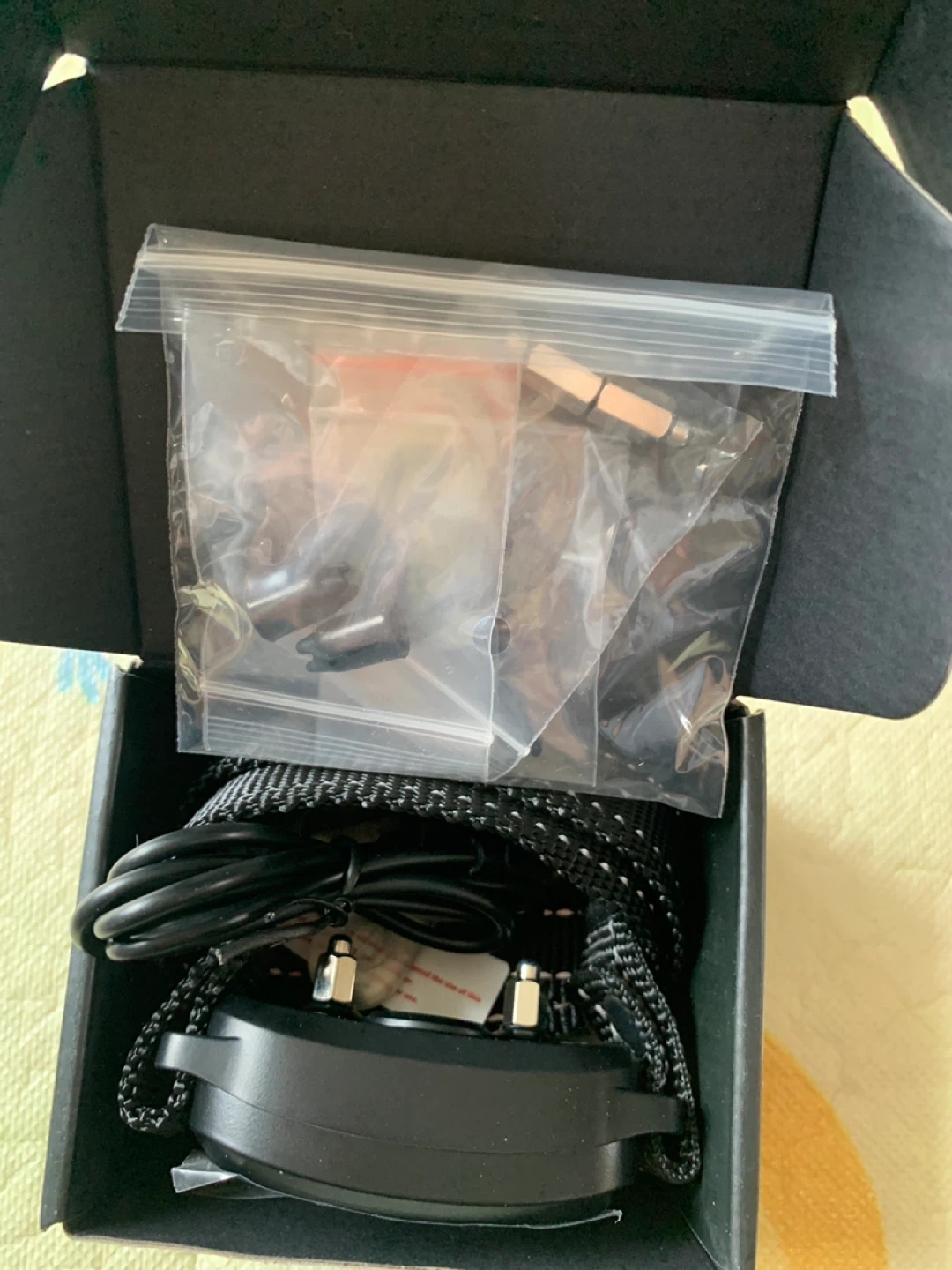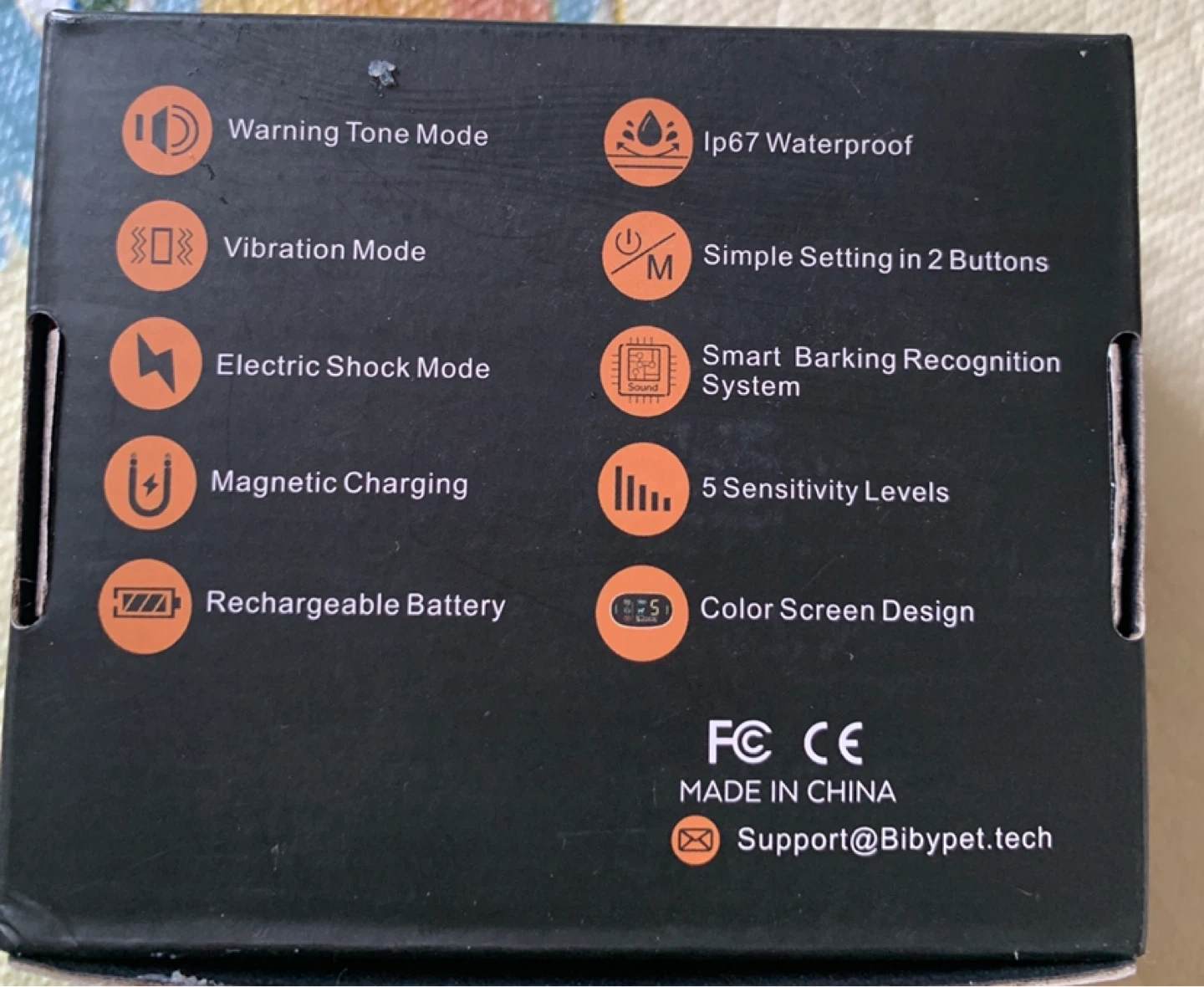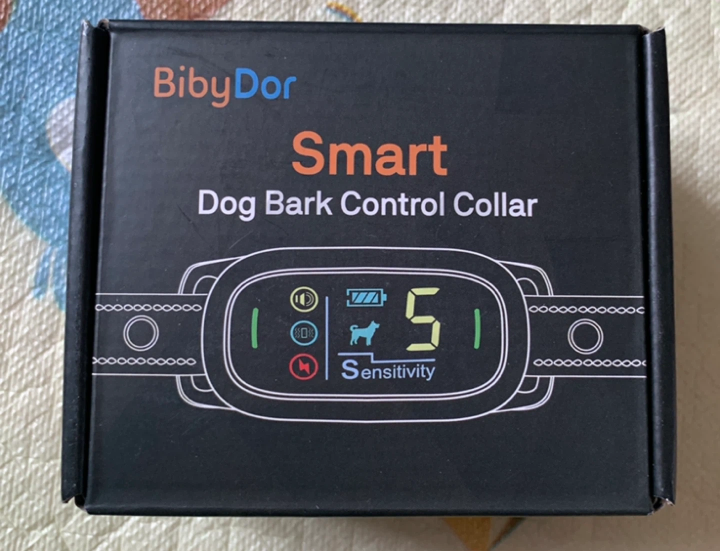 This BibyDor Smart Dog Bark Control Collar features warning tone, vibration, and electric shock modes. It's IP67 waterproof and has a rechargeable battery with magnetic charging. The collar offers 5 sensitivity levels and a smart barking recognition system. It includes the original box and accessories.