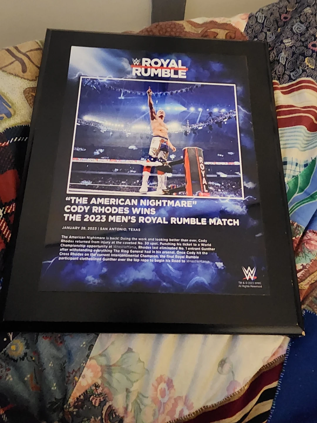 This is a framed print celebrating Cody Rhodes winning the 2023 Men's Royal Rumble Match. It features "The American Nightmare" and details his victory. The print is dated January 28, 2023, from San Antonio, Texas. It includes information about his match against Gunther.