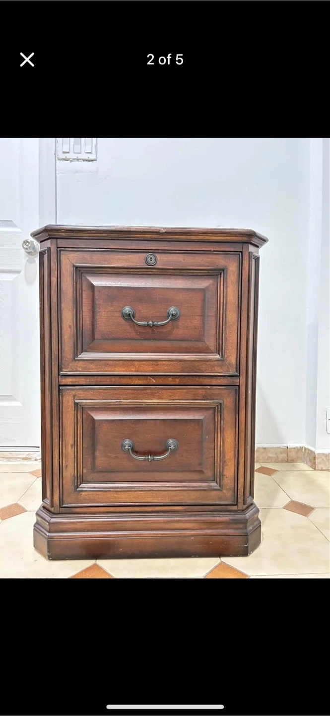 Here's a lovely wooden filing cabinet with two drawers. It's a great piece for adding some classic style to your home office or workspace. The drawers provide ample storage for your important documents and files. It's in good condition and ready to use!