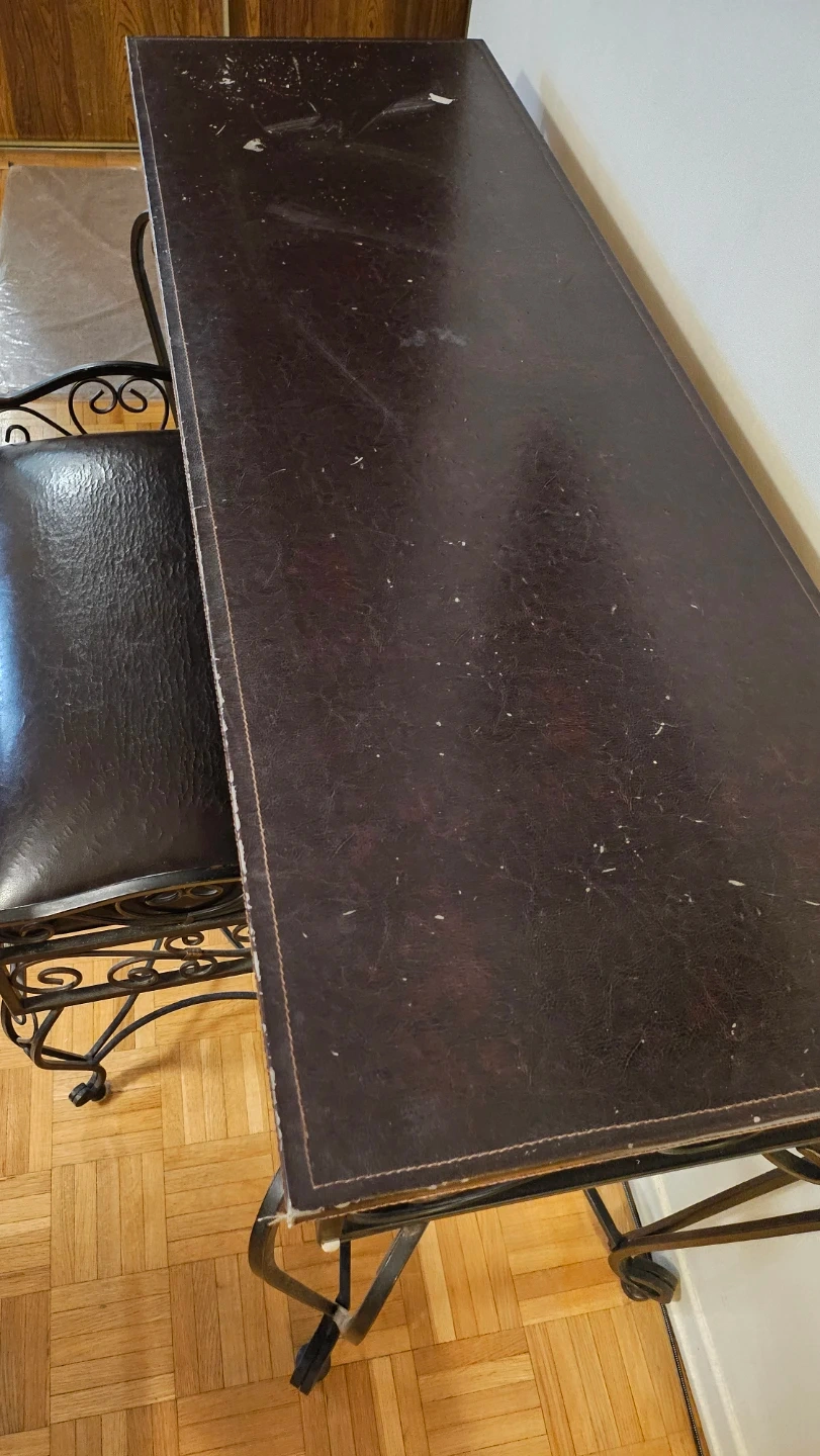 A dark brown wrought iron console table set with a matching mirror and upholstered bench. The table top is dark and has some surface wear. The wrought iron features decorative scrollwork.