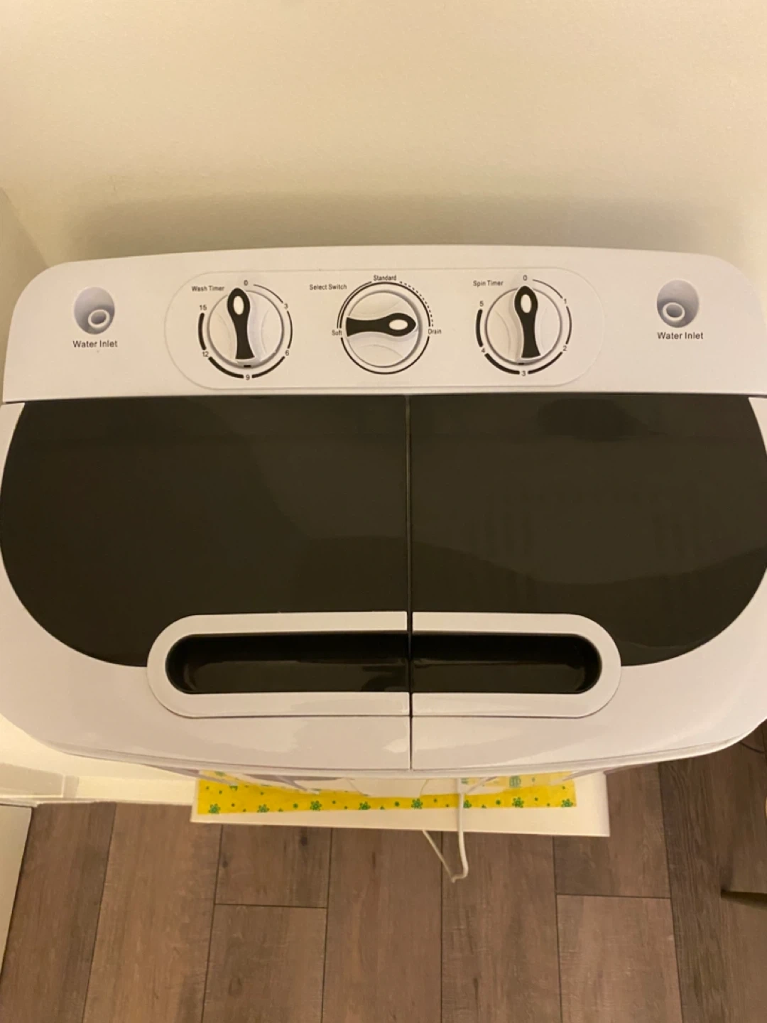 This is a compact twin tub washing machine. It features separate tubs for washing and spinning. The controls include a wash timer, spin timer, and select switch for wash or drain functions.