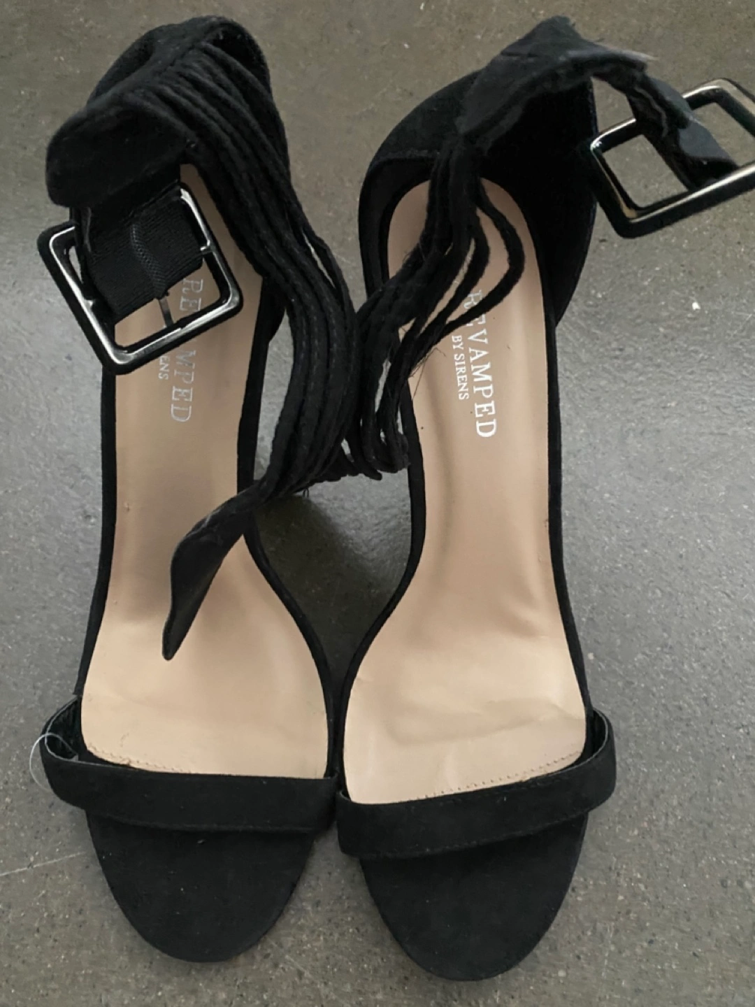 Elegant black suede heels. Ankle-tie detail. Slight heel. Open-toe design.