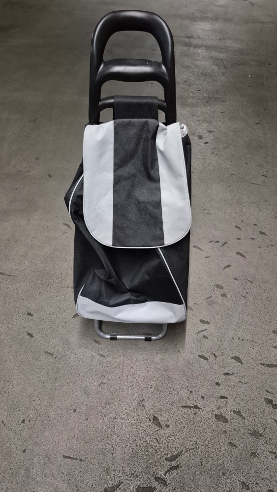 Selling a handy shopping trolley cart in black and white. It's perfect for carrying groceries or other items with ease. The wheels roll smoothly, and the handle is comfortable to grip. Great for trips to the market or laundry runs!
