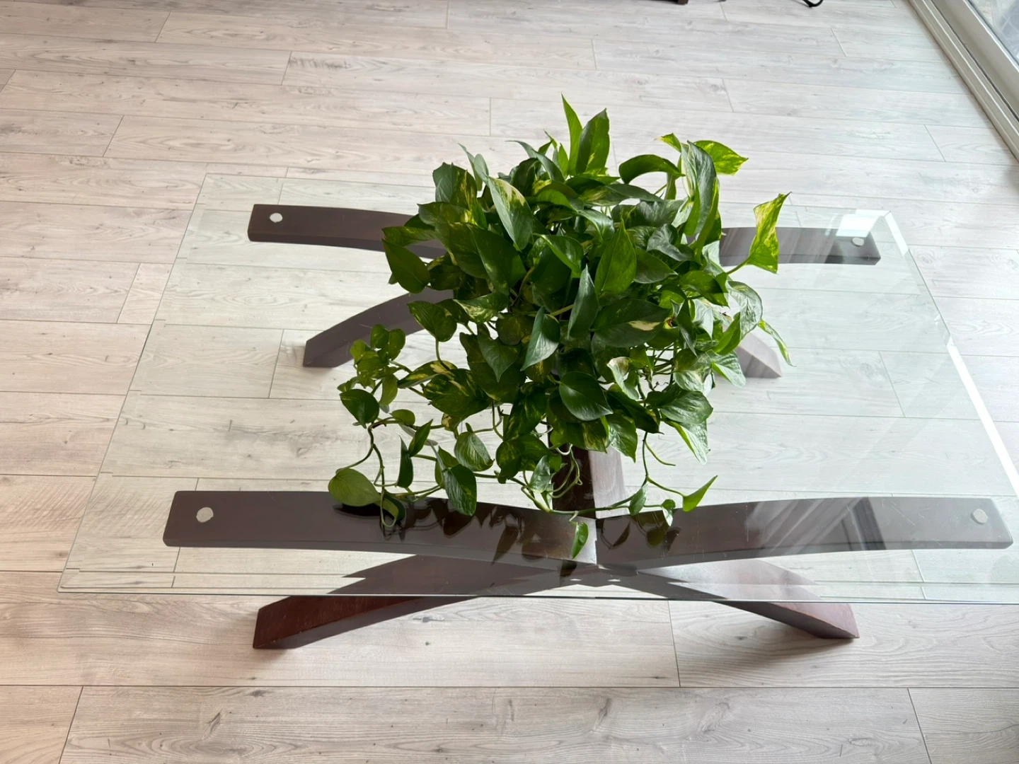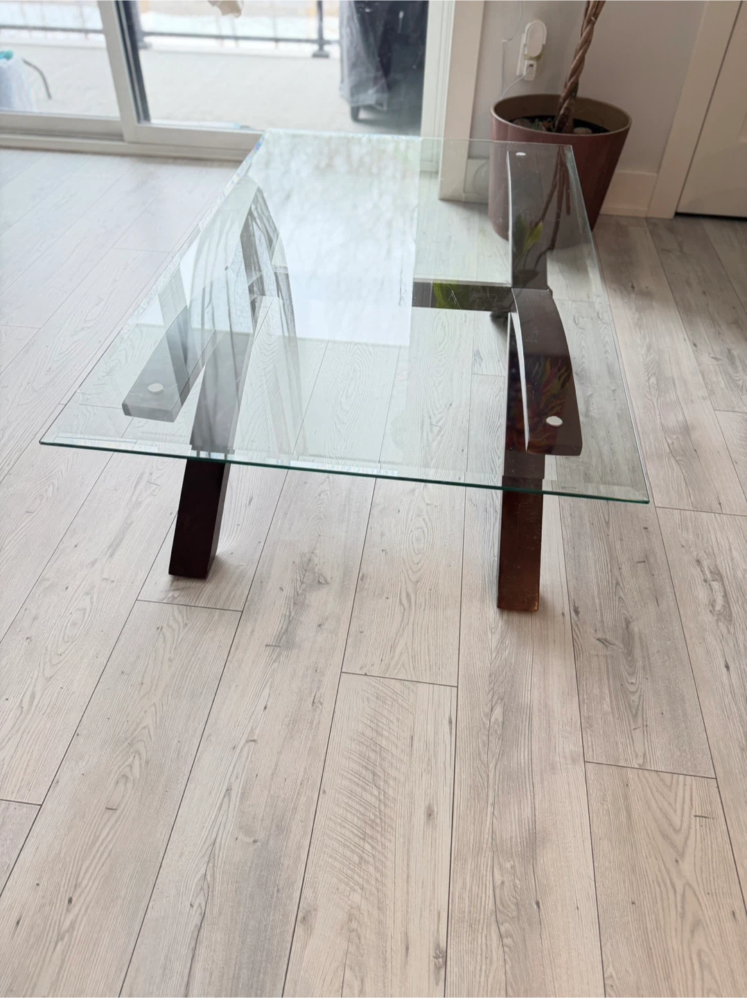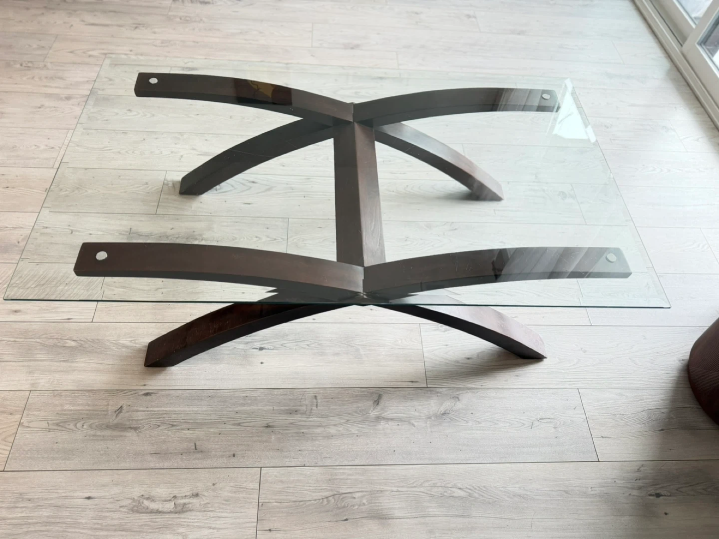 A stylish glass top coffee table with a dark wood base. It's a nice addition to any living room. Perfect for placing drinks and decor.