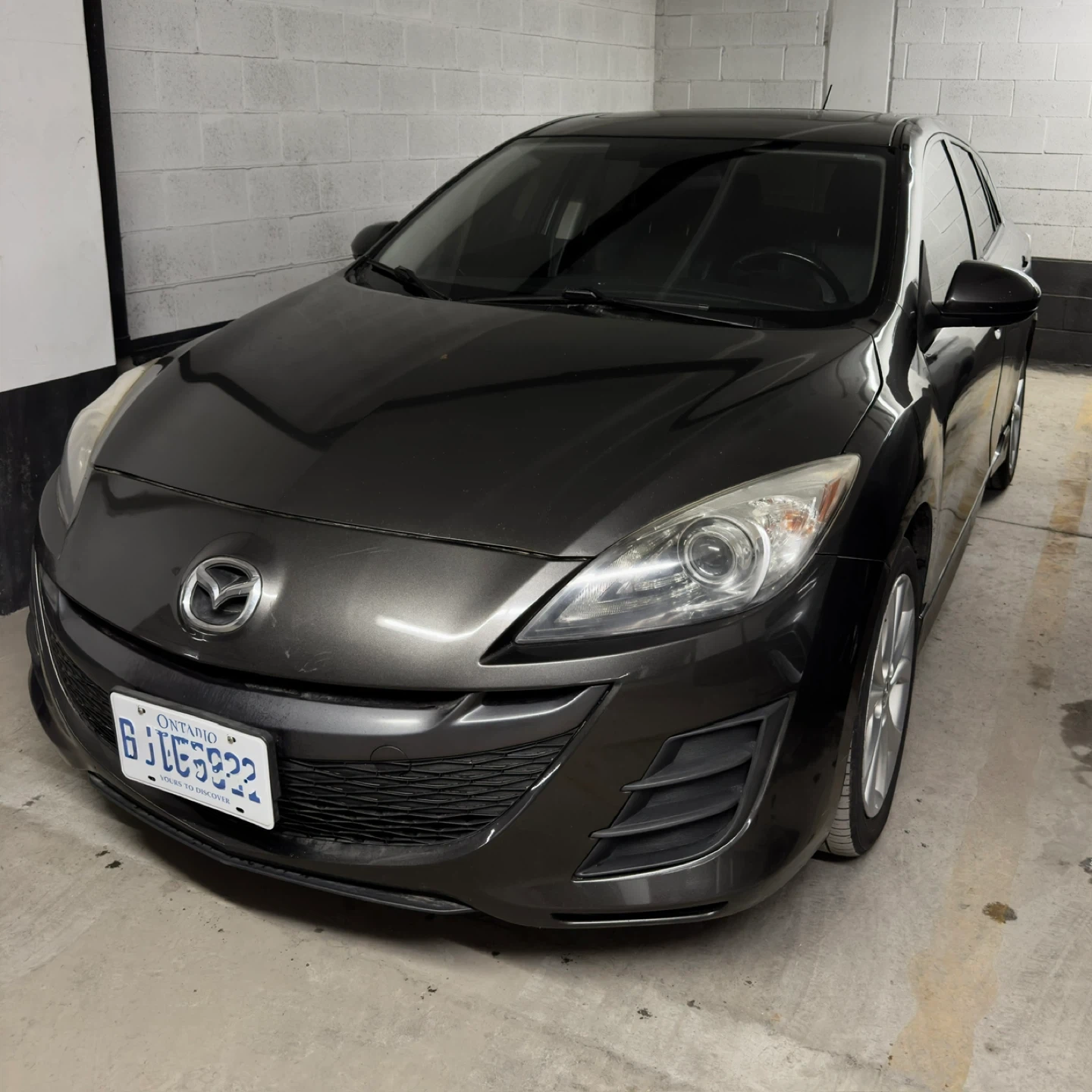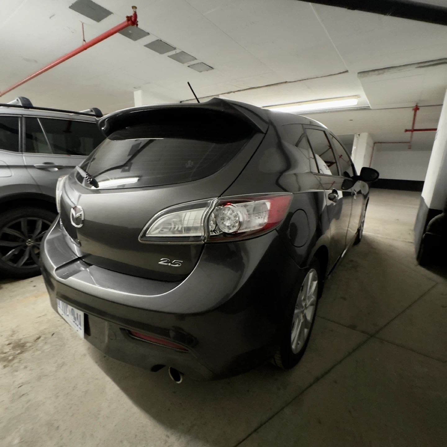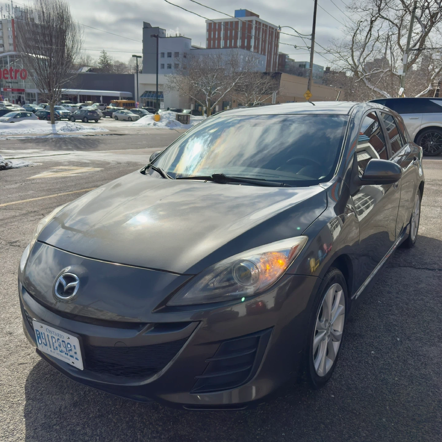 A grey Mazda 3 hatchback with a 2.5L engine. It features a backup camera integrated into the infotainment system. Heated seats are included.