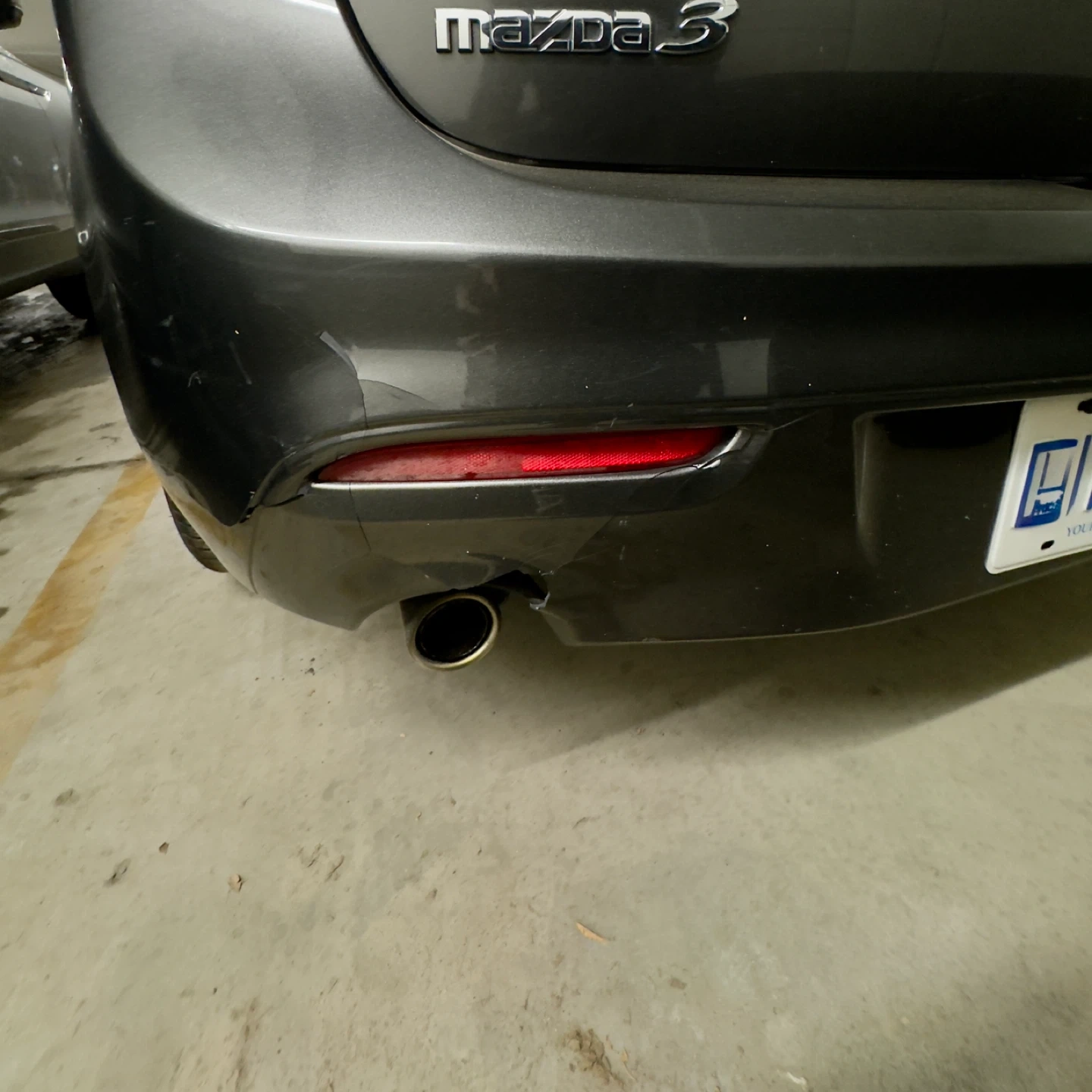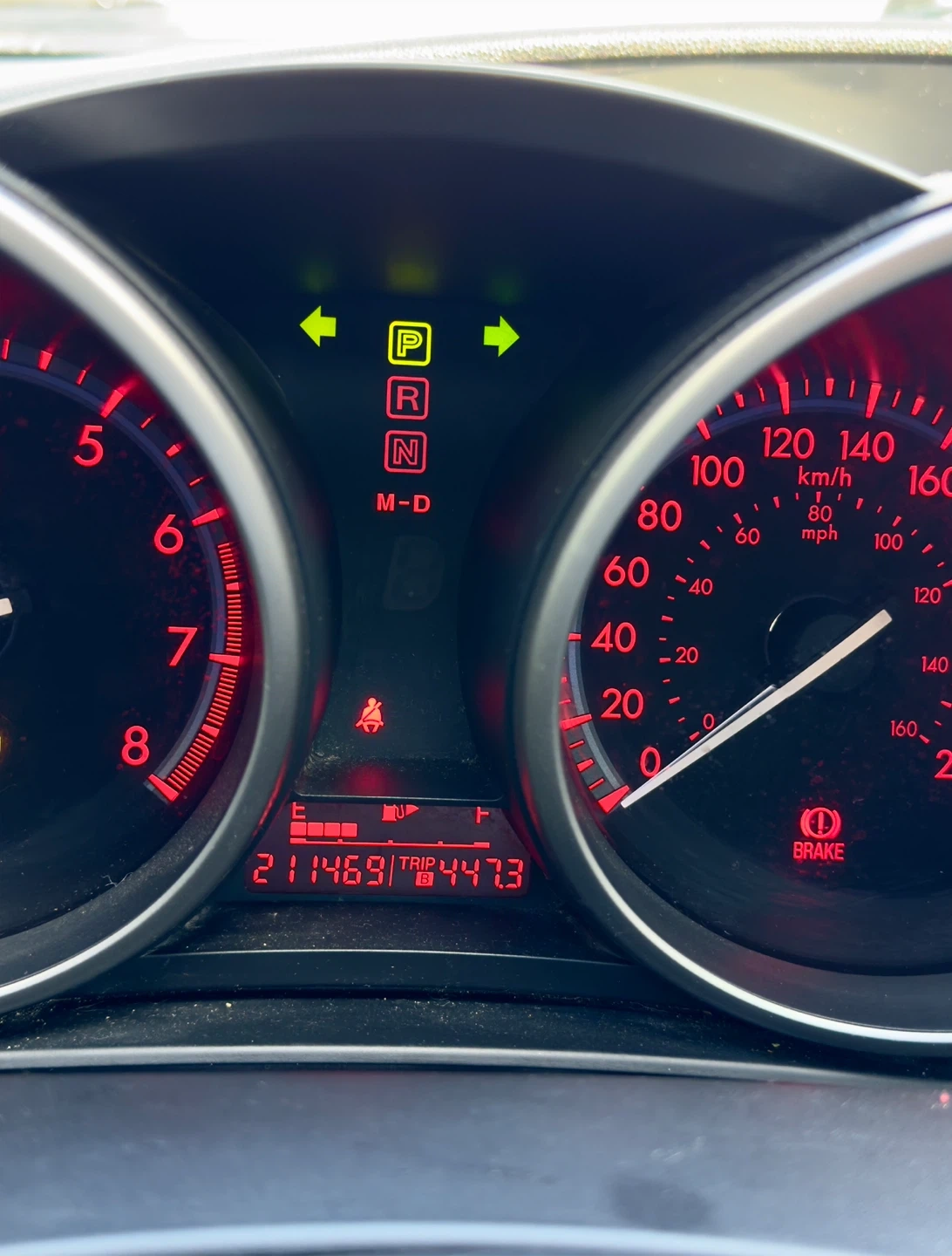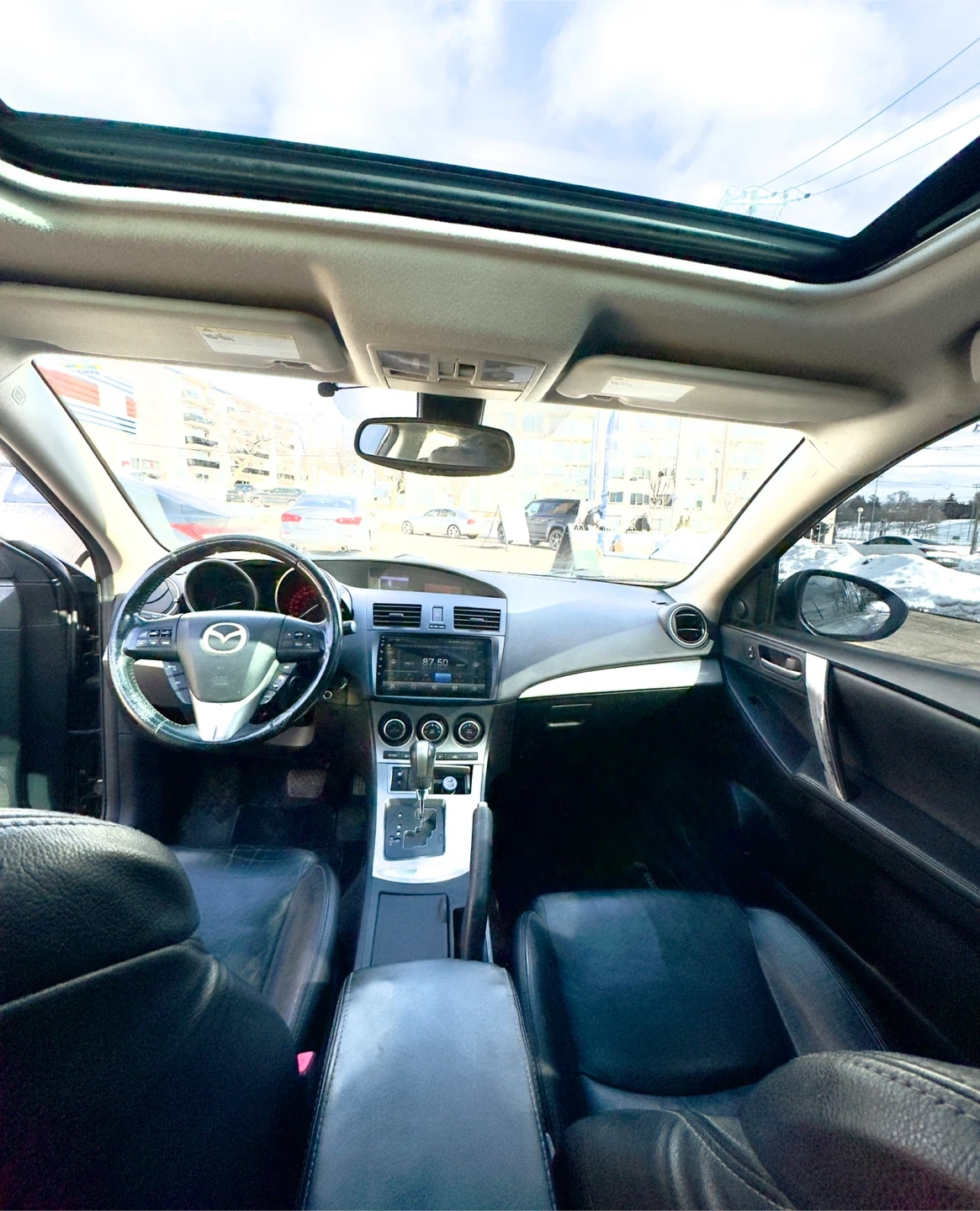 A grey Mazda 3 hatchback with a 2.5L engine. It features a backup camera integrated into the infotainment system. Heated seats are included.
