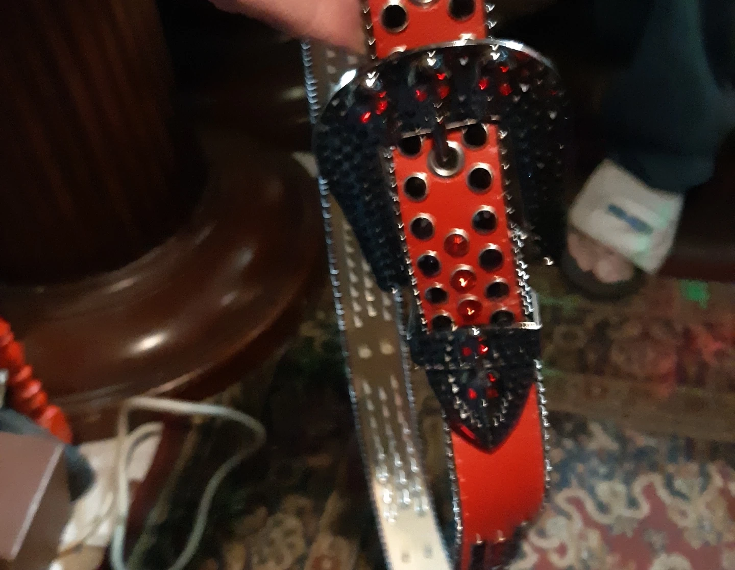Selling a red rhinestone belt. It has a unique design with rhinestones and decorative elements. Would look great with any outfit!
