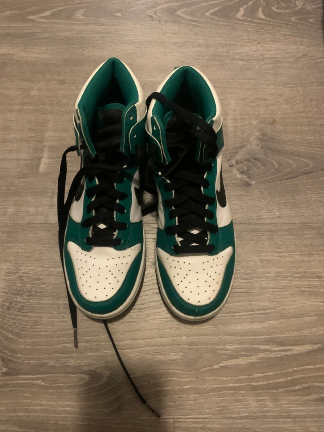 These are Nike Dunk High sneakers in an emerald green and white colorway. They feature a lace-up closure and a high-top design. A classic silhouette for everyday wear! Women’s size 8.5-9 and men’s 7