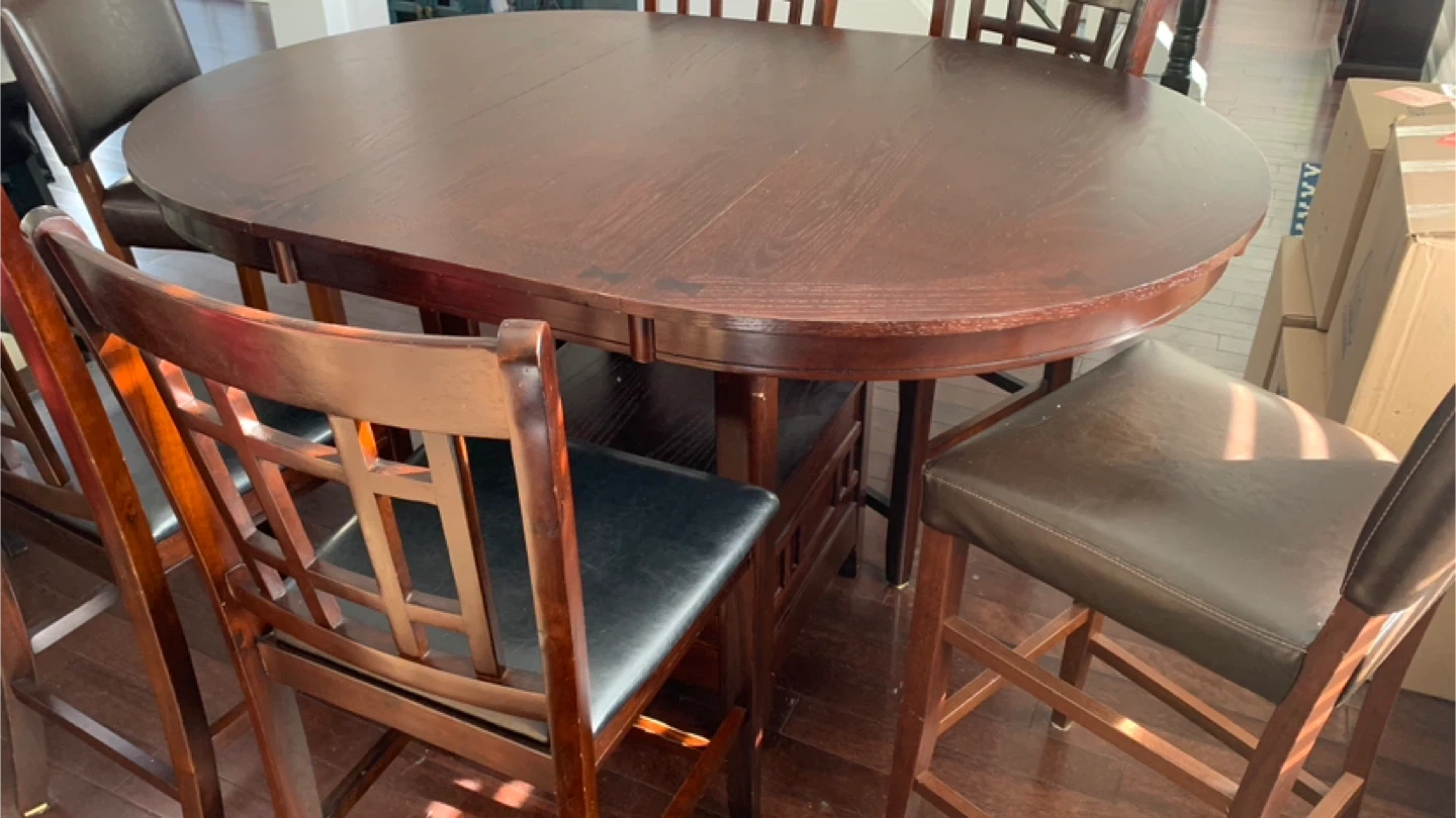 Great condition 7pc Counter-Height Dining Set with 6 chairs. Features a round oak brown table with a 42-60 inch extension. Let me know if you're interested!