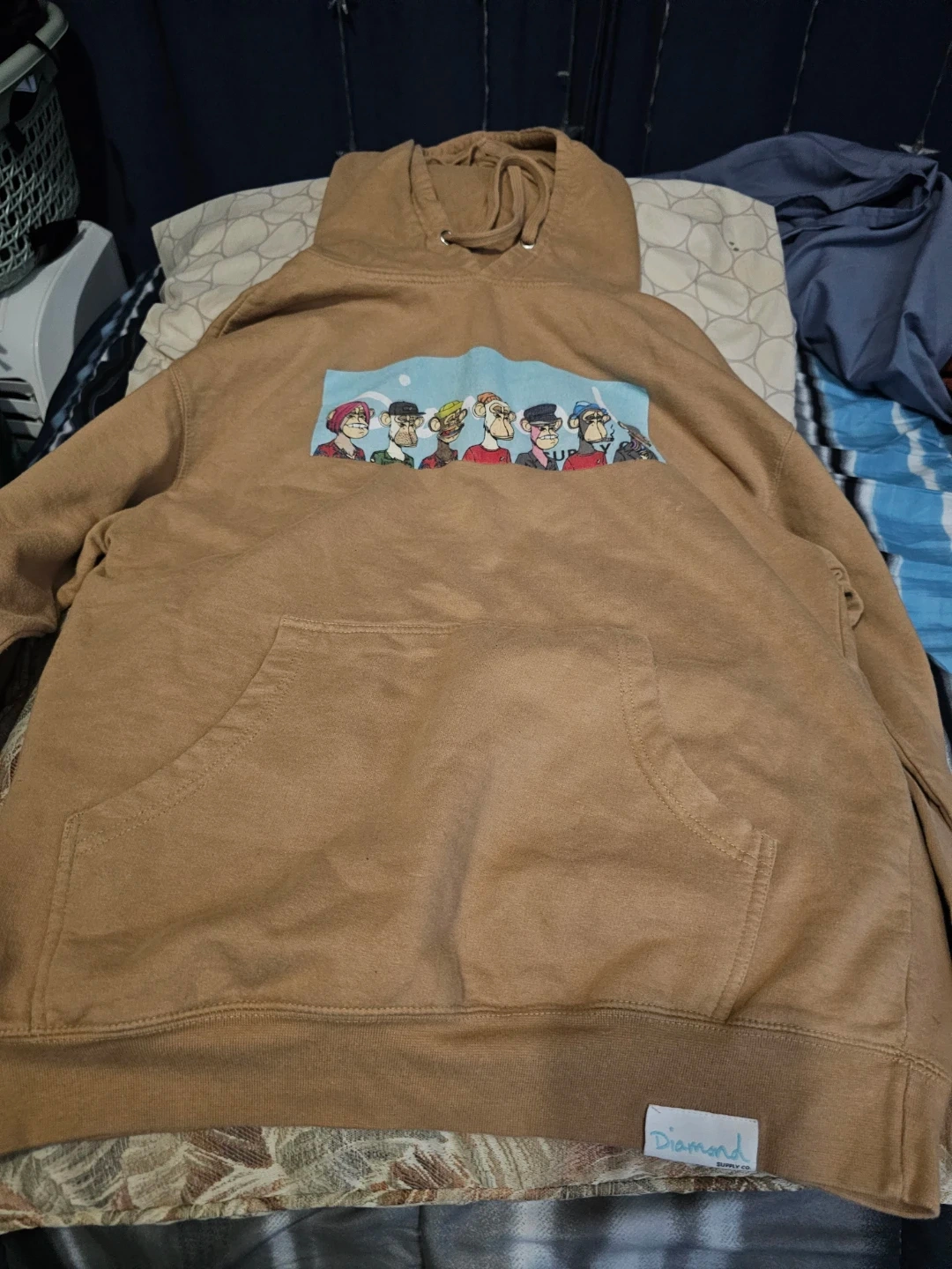This is a tan Diamond Supply Co. hoodie with a graphic print on the front. It's a size Large. Cotton blend material.