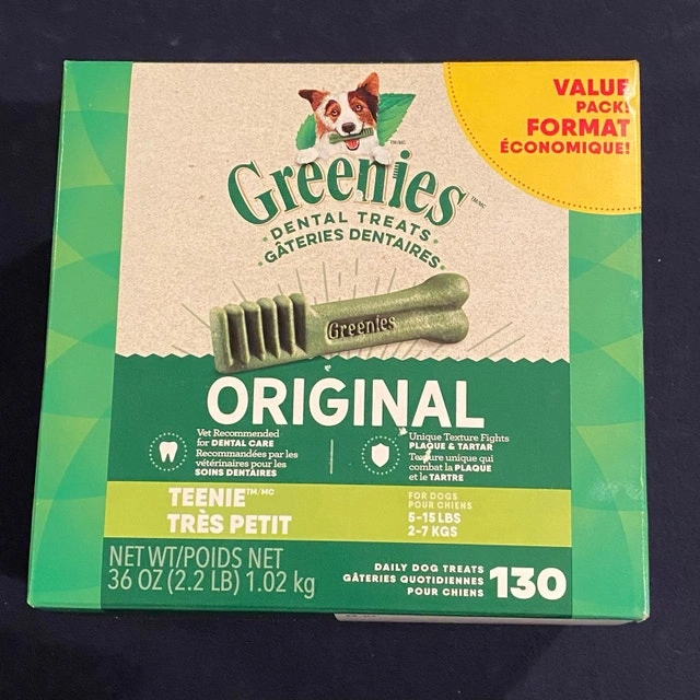 Selling a value pack of Greenies dental treats for teenie-sized dogs, 130 treats in the box. Perfect for daily dental care and fresh breath! These Greenies are designed for dogs weighing between 5-15 lbs (2-7 kgs). The box is new and in excellent condition. Dog Size: Teenie (5-15 lbs / 2-7 kgs), Quantity: 130 treats, Type: Dental Treats. Pricing competitively for a quick sale. If the ad is still up, the Greenies are still available. Curbside pickup. Cash accepted.