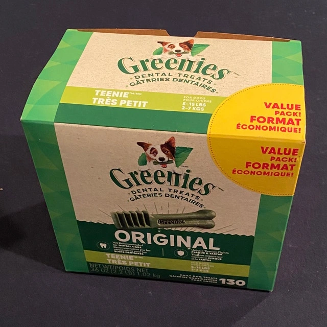 Selling a value pack of Greenies dental treats for teenie-sized dogs, 130 treats in the box. Perfect for daily dental care and fresh breath! These Greenies are designed for dogs weighing between 5-15 lbs (2-7 kgs). The box is new and in excellent condition. Dog Size: Teenie (5-15 lbs / 2-7 kgs), Quantity: 130 treats, Type: Dental Treats. Pricing competitively for a quick sale. If the ad is still up, the Greenies are still available. Curbside pickup. Cash accepted.