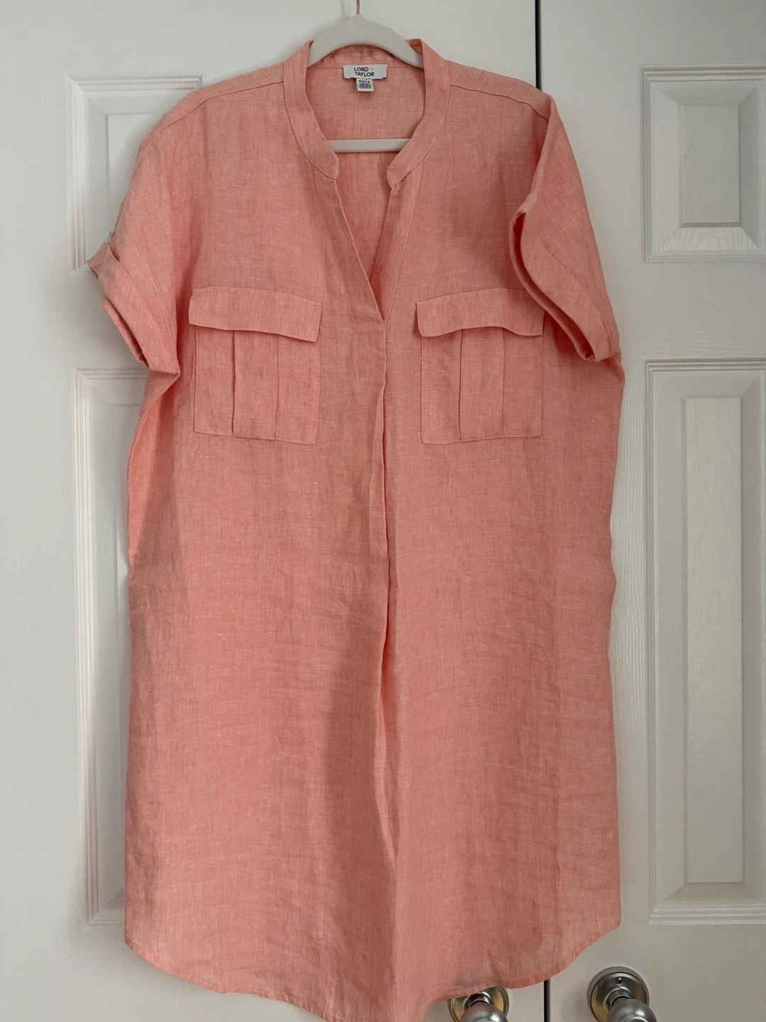 This is a Lord & Taylor shirt dress. It's made from a linen in a peach colour. Features a collarless neckline and two chest pockets.