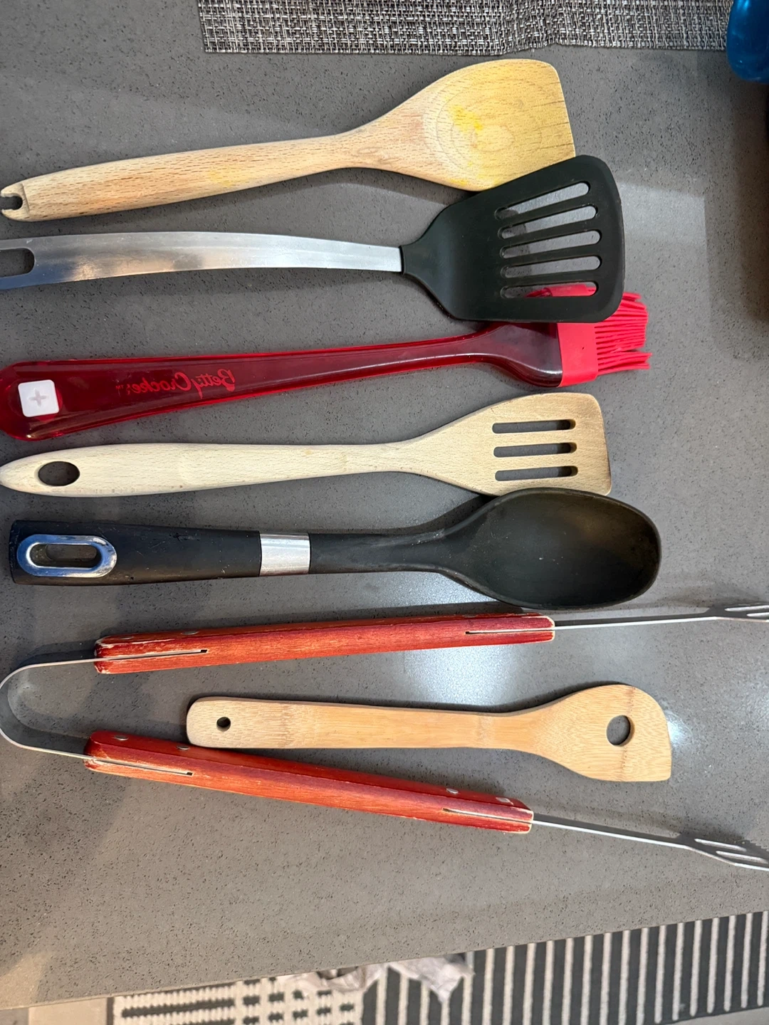 Set of six kitchen utensils including wooden spoons, spatulas, and tongs. Features a red handled basting brush and a black slotted spatula. Mostly wood and plastic construction.
