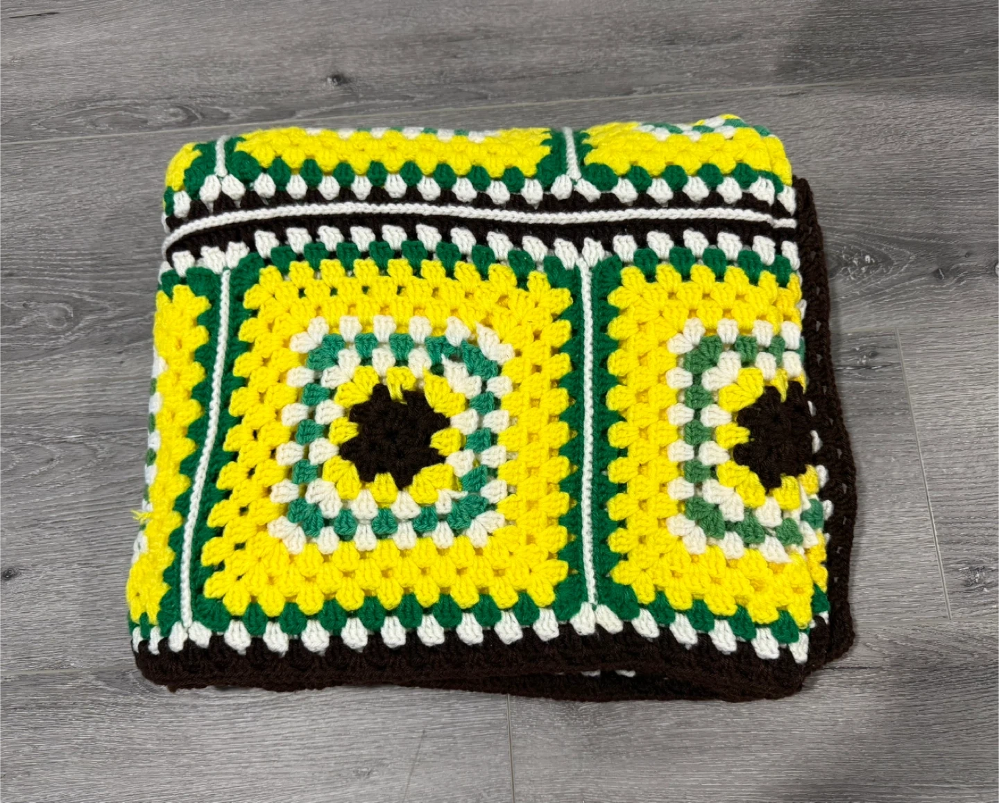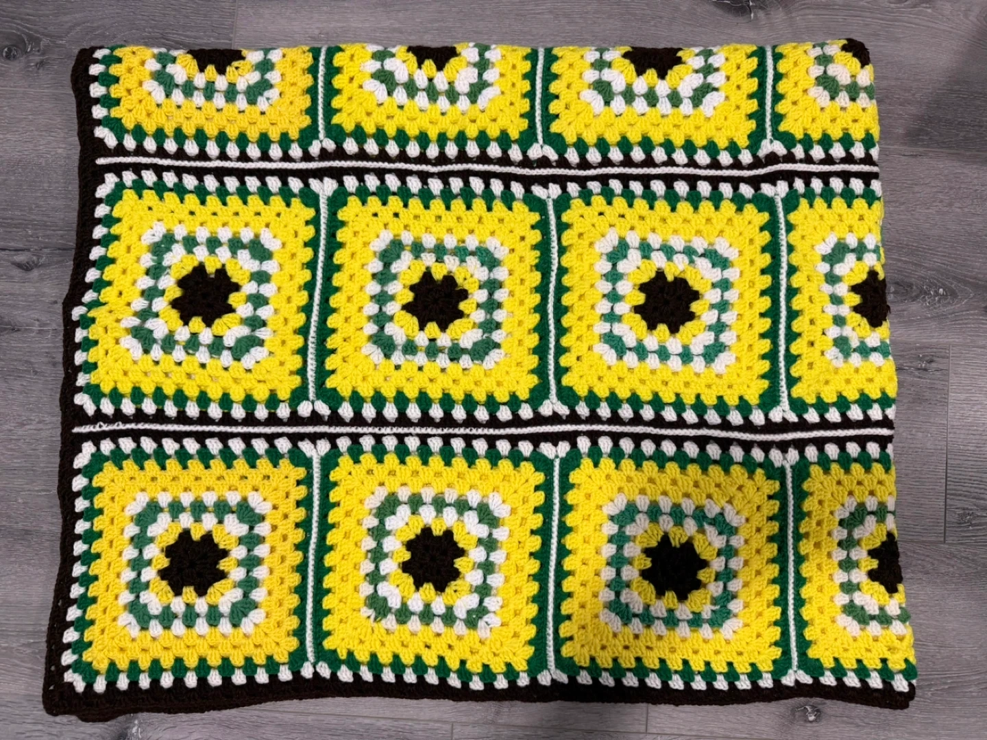 Vintage handmade crocheted acrylic blanket featuring granny squares in yellow, green, white, and dark brown.