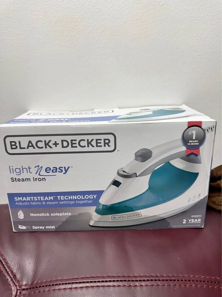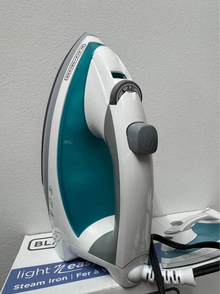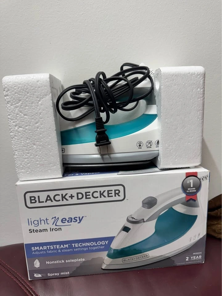 Excellent Black+Decker Light 'N Easy steam iron in white and teal. This model IR0820C has smartsteam technology that adjusts fabric and steam settings together. It is equipped with a nonstick soleplate and spray mist function. Original box and packaging are included.