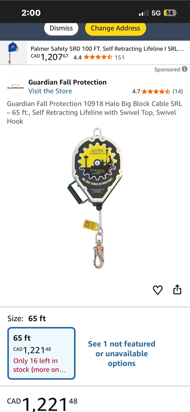 Selling a Guardian Fall Protection 10918 Halo Big Block Cable SRL with Swivel Top and Swivel Hook. It's 65 ft in size.