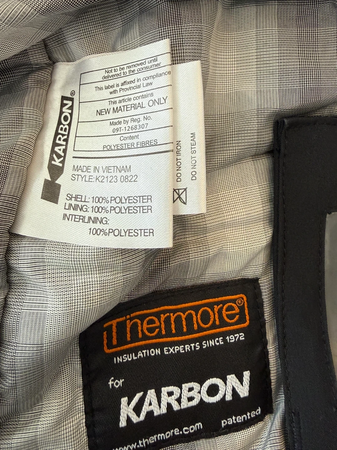 This Karbon ski jacket is red and black. Shell is 100% polyester with 100% polyester interlining. It's insulated with Thermore. Perfect for hitting the slopes!