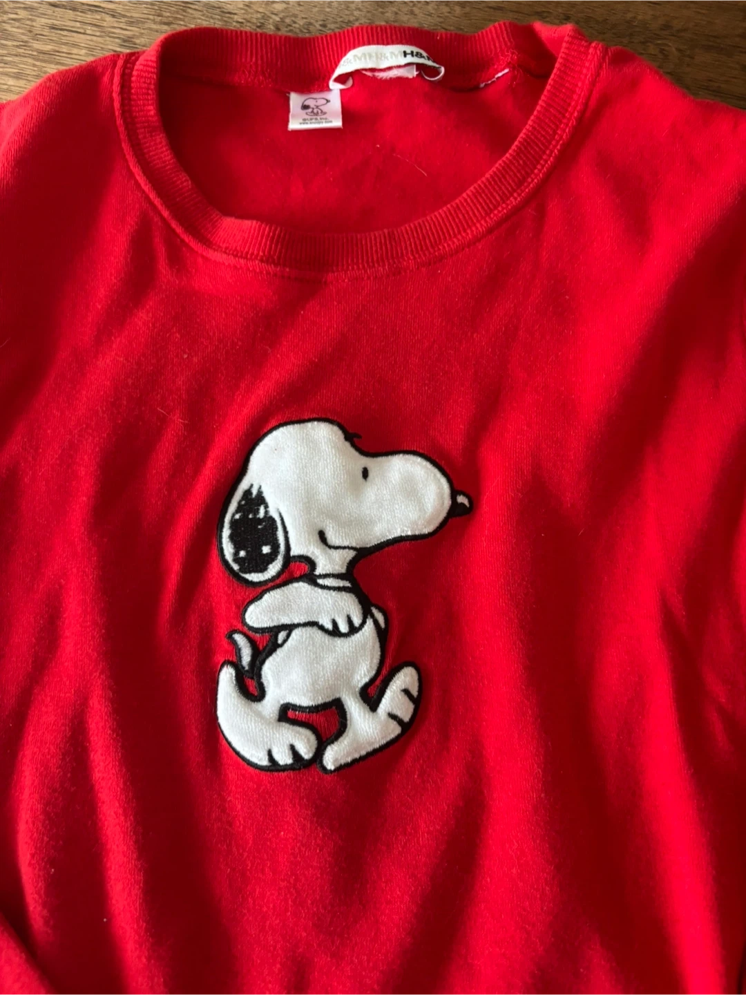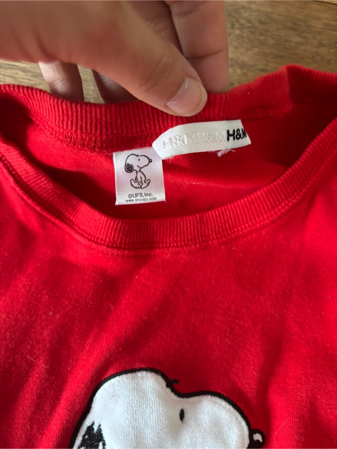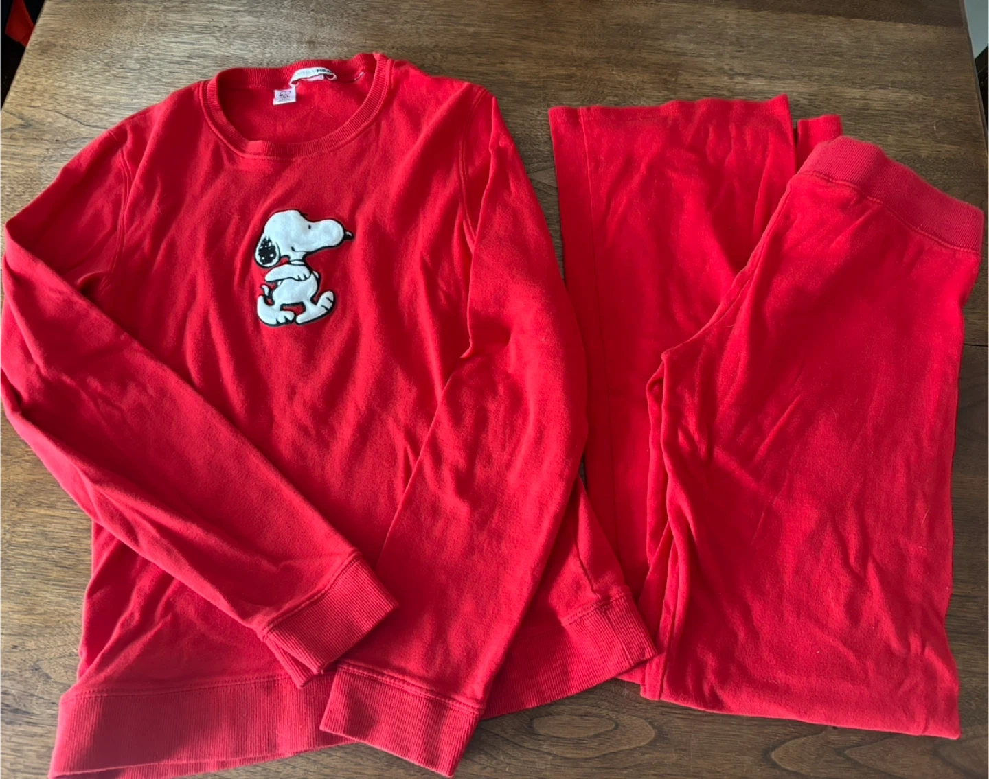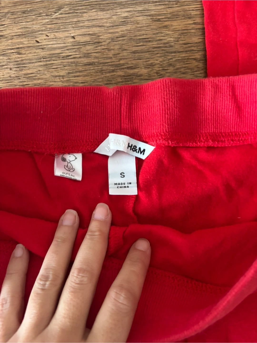 This red H&M pajama set features a Snoopy graphic on the top. It's a size small. The set includes a long-sleeved top and matching pants.