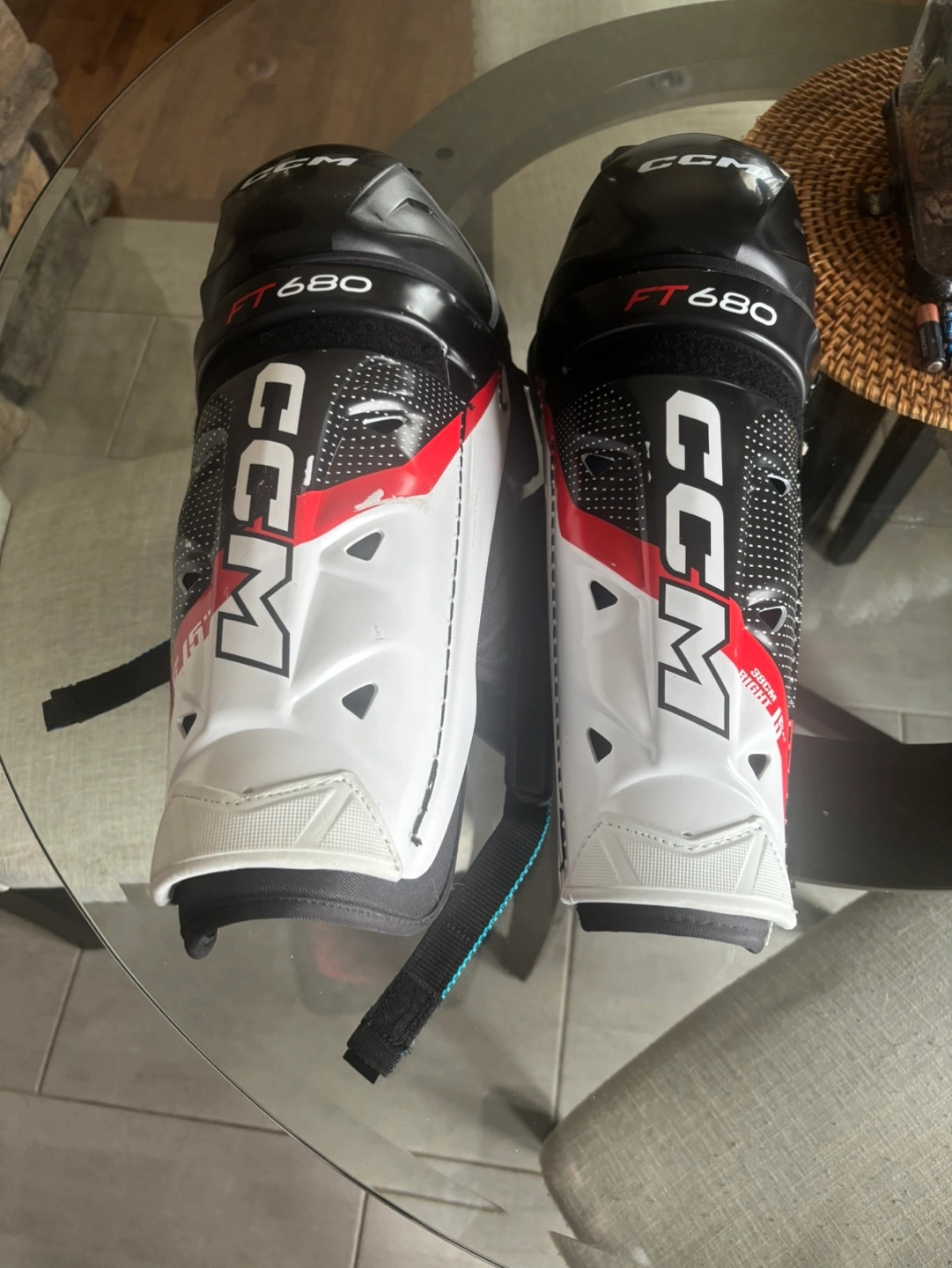 CCM FT680 junior hockey shin guards. Size 15 inches. Red, white, and black. Right and left guards included. New