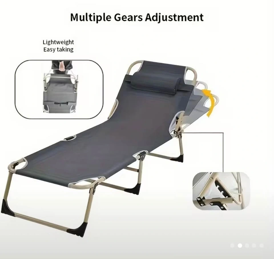 Single folding recliner bed with sturdy iron frame. Lightweight, portable, and easy to fold—perfect for outdoor use, camping, car camping, patio, or relaxing.