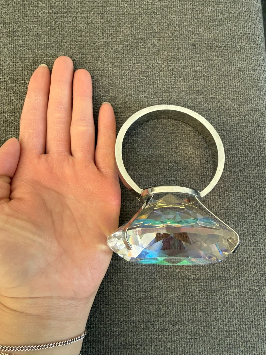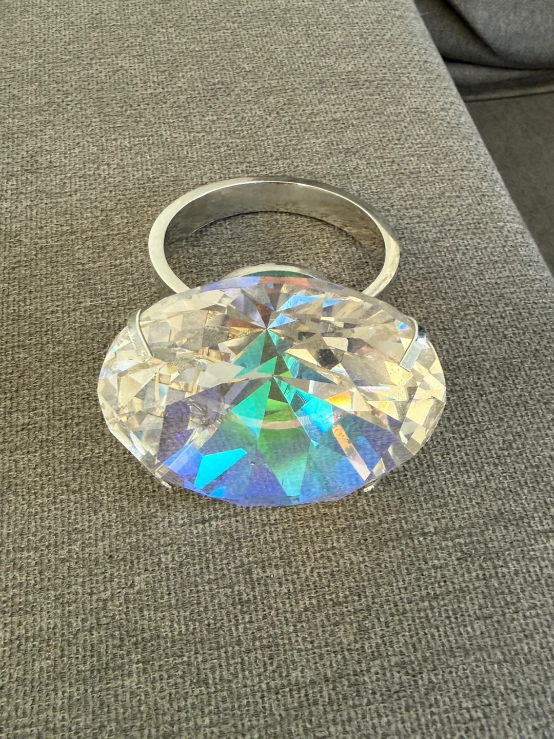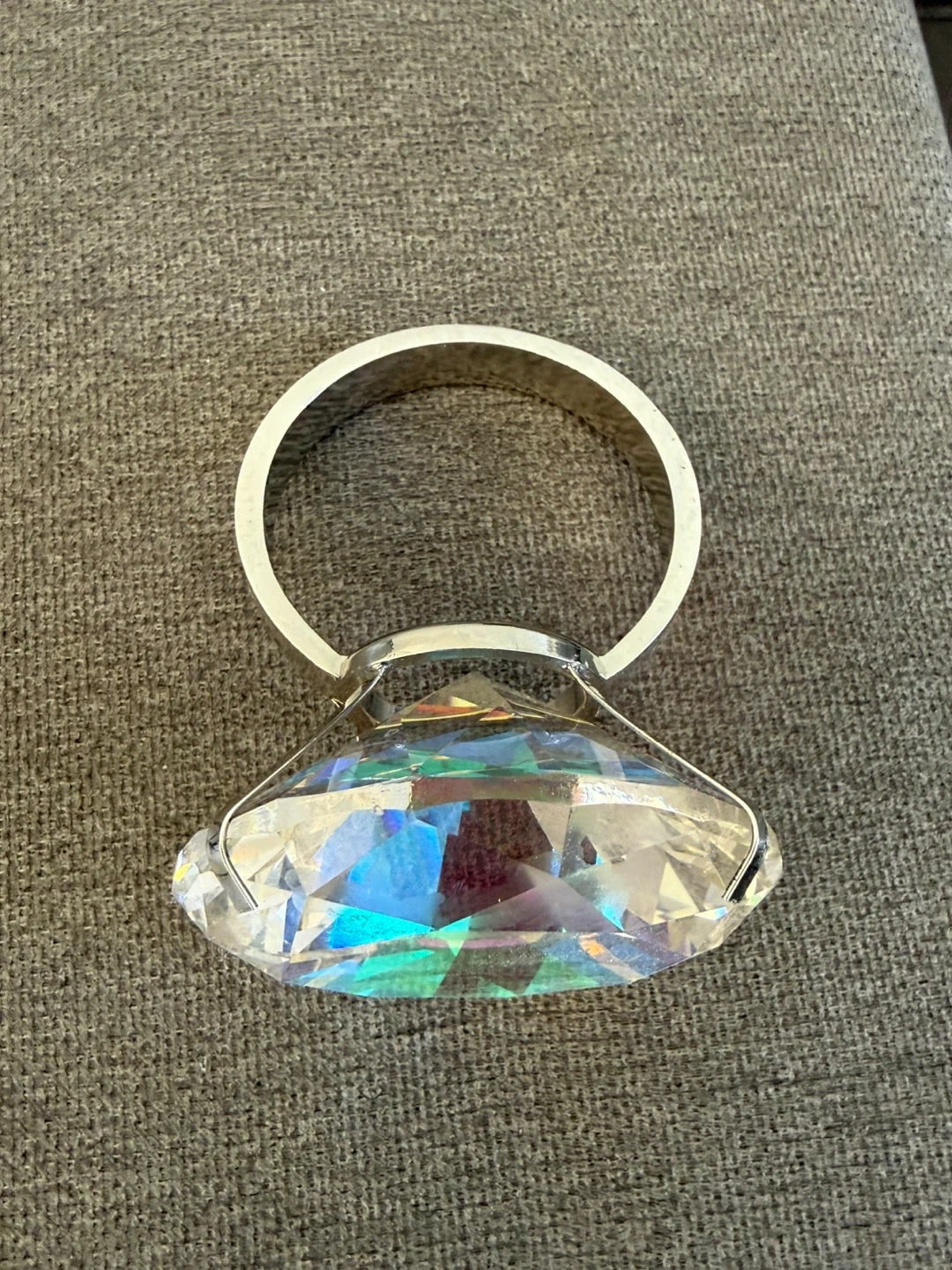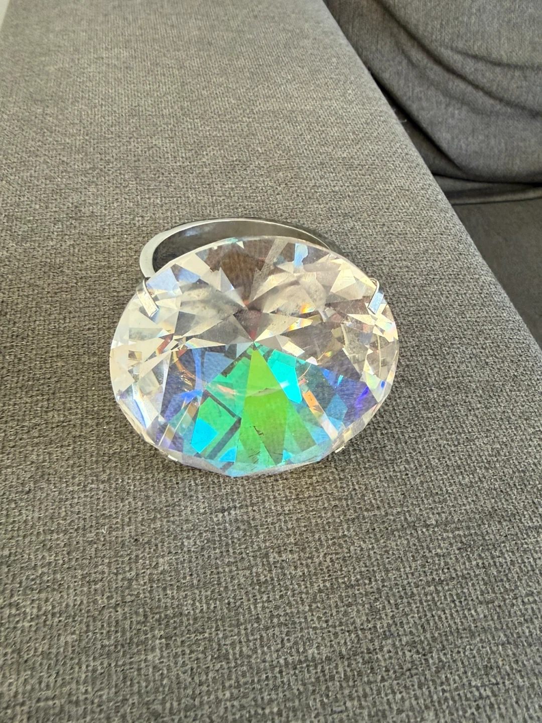 Sparkly crystal paperweight with a shiny silver ring. It's quite heavy and beautifully cut to catch the light. A nice decorative piece for any desk or shelf!