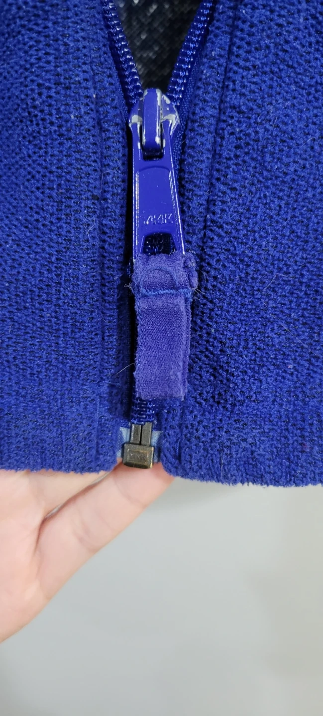 Wear worn, several pulls on both sleeves. Main and pocket zippers are in excellent shape.
