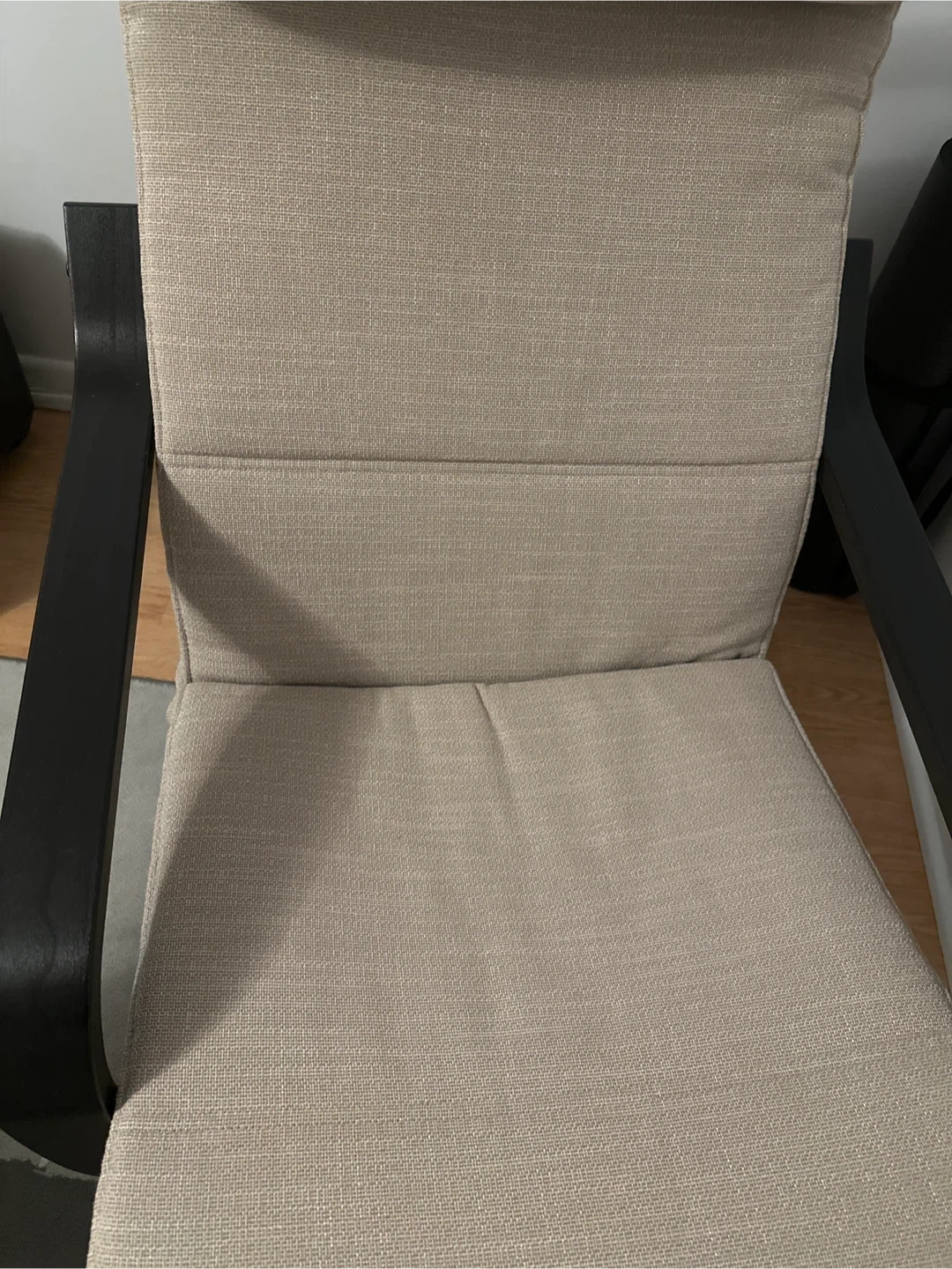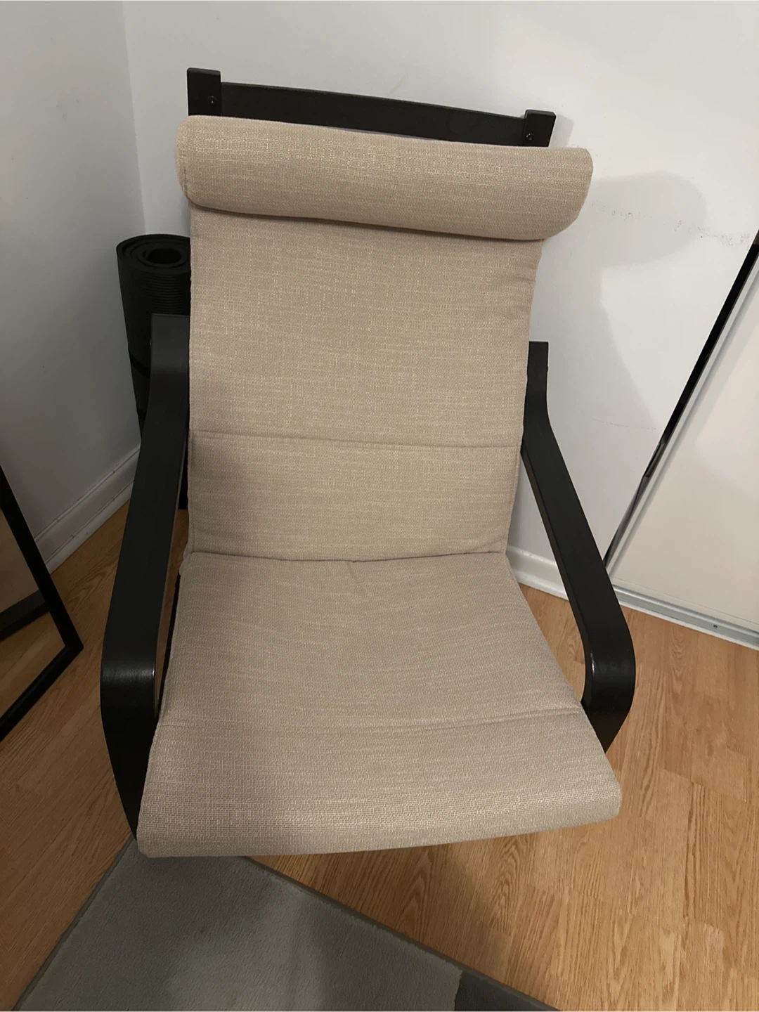 Selling a gently used IKEA Poang chair! It's in great shape and super comfy for relaxing. The frame is a dark colour and the cushion is a neutral beige colour. A perfect addition to any living room or reading nook!