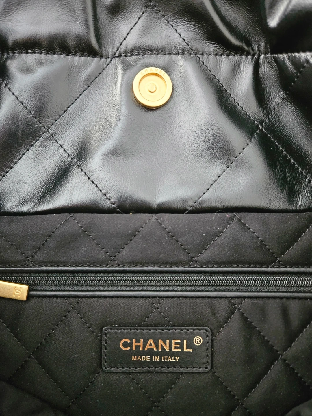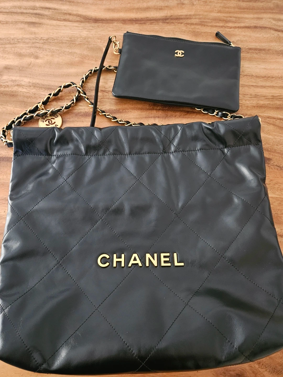 It is 1:1 quality 22 bag small size shiny calfskin black in gold hardware. I've added a discreet anti-wear pad to the chain drawstring area.