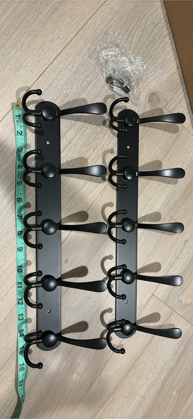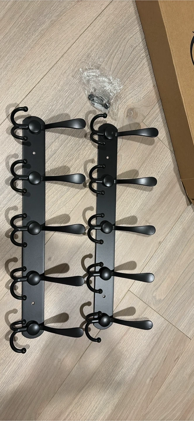 Selling a set of two ENCOZY wall-mounted coat racks in black metal. They are in great condition and come with the original box and mounting hardware. Each rack measures approximately 16 inches in length, perfect for adding some extra storage to your entryway or closet
