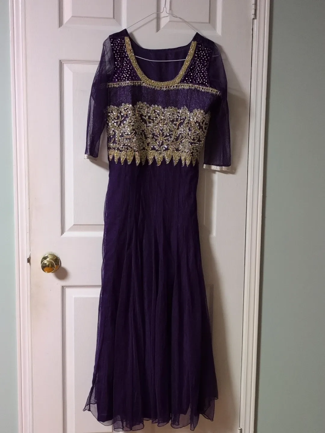 A beautiful deep purple Anarkali dress with intricate gold and silver embellishments on the bodice and neckline. It features sheer sleeves and a flowing, layered skirt.