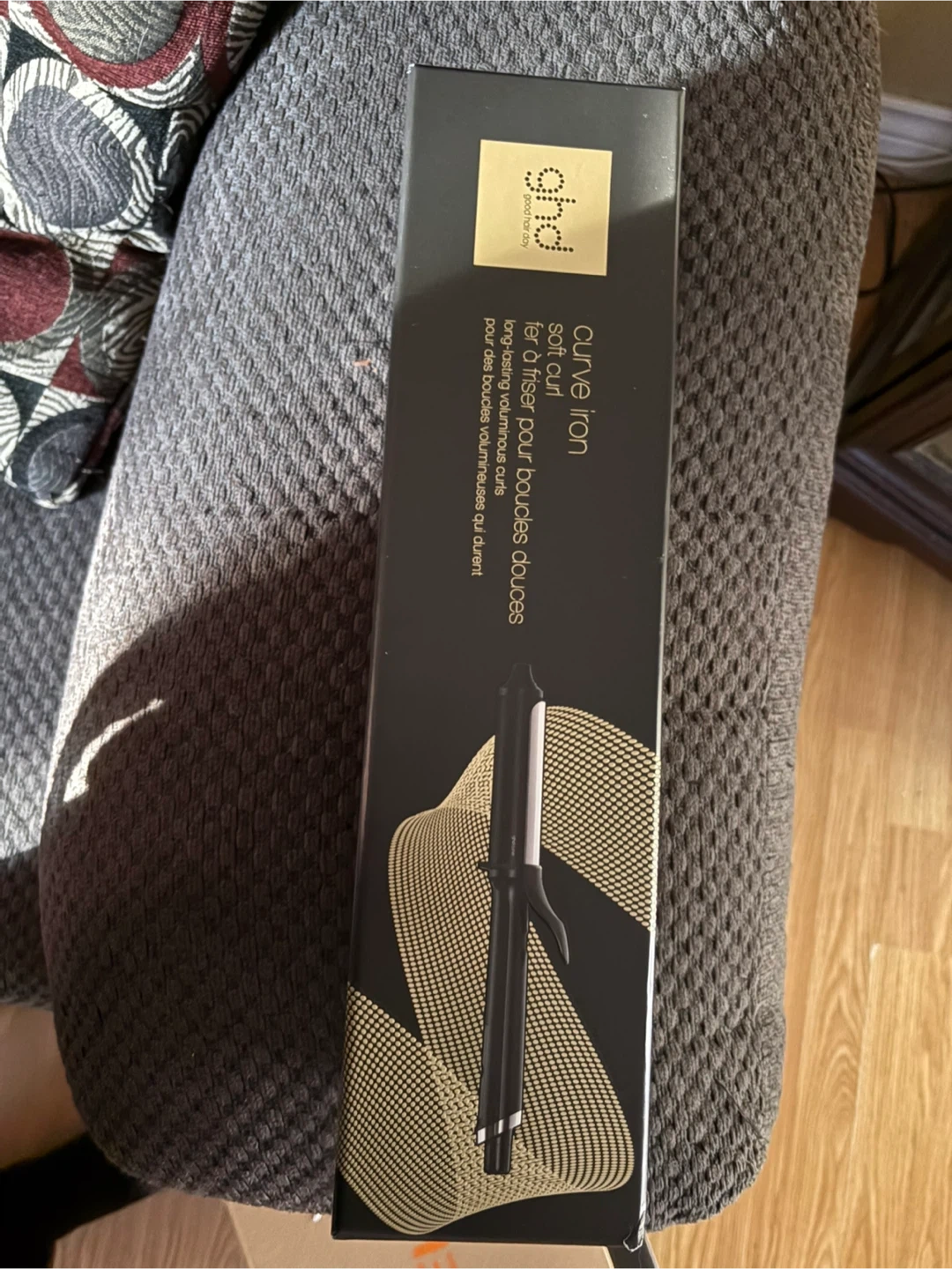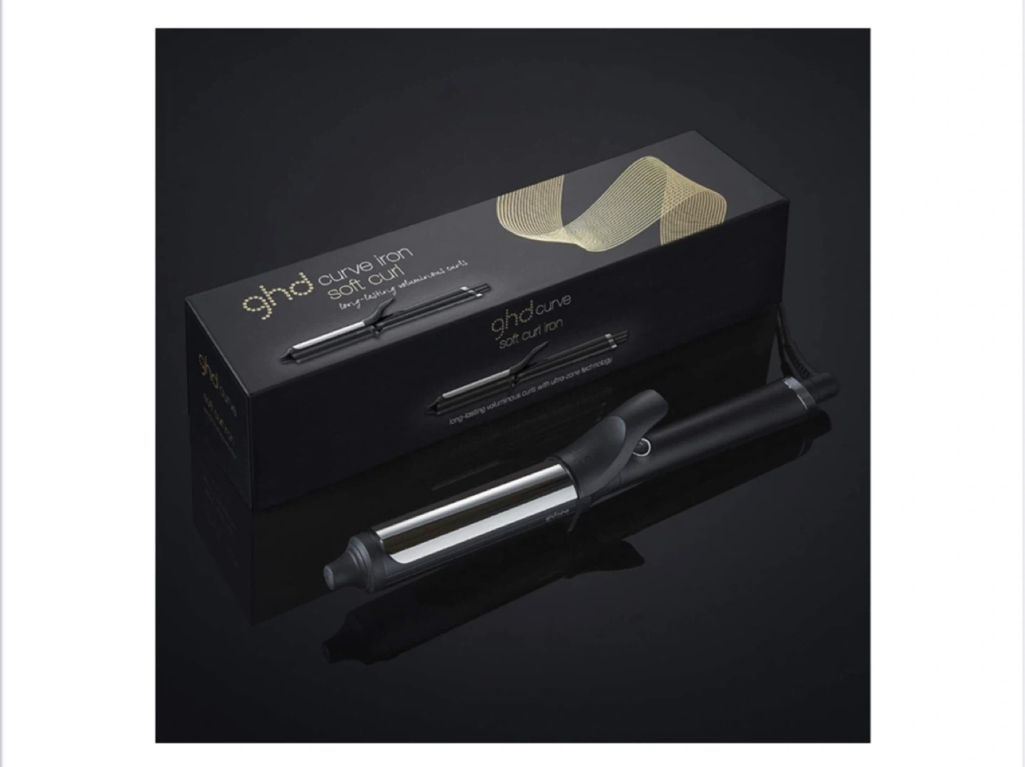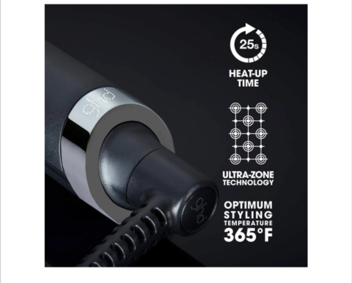 This is the ghd Curve Iron Soft Curl hair wand. It features ultra-zone technology for optimum styling temperature at 365°F. Heat-up time is 25 seconds. The cord is 8.8 ft long.