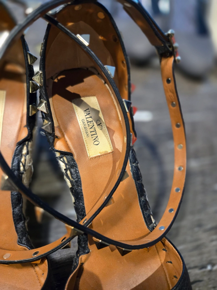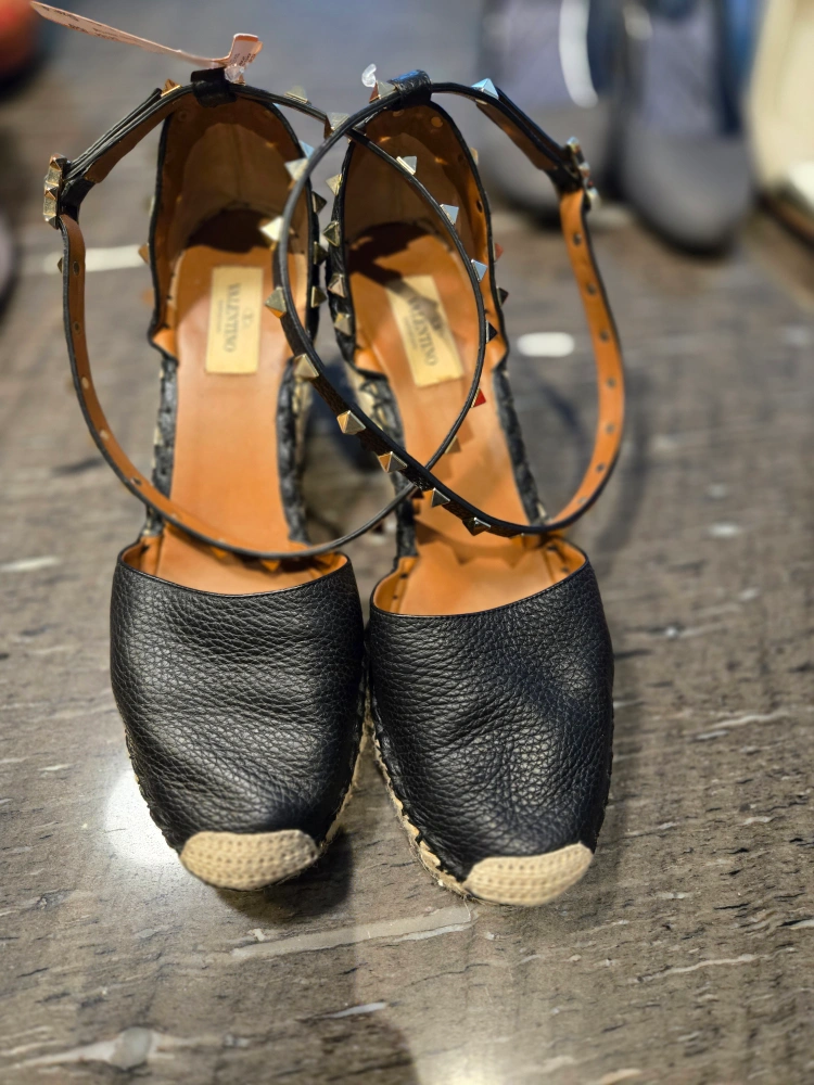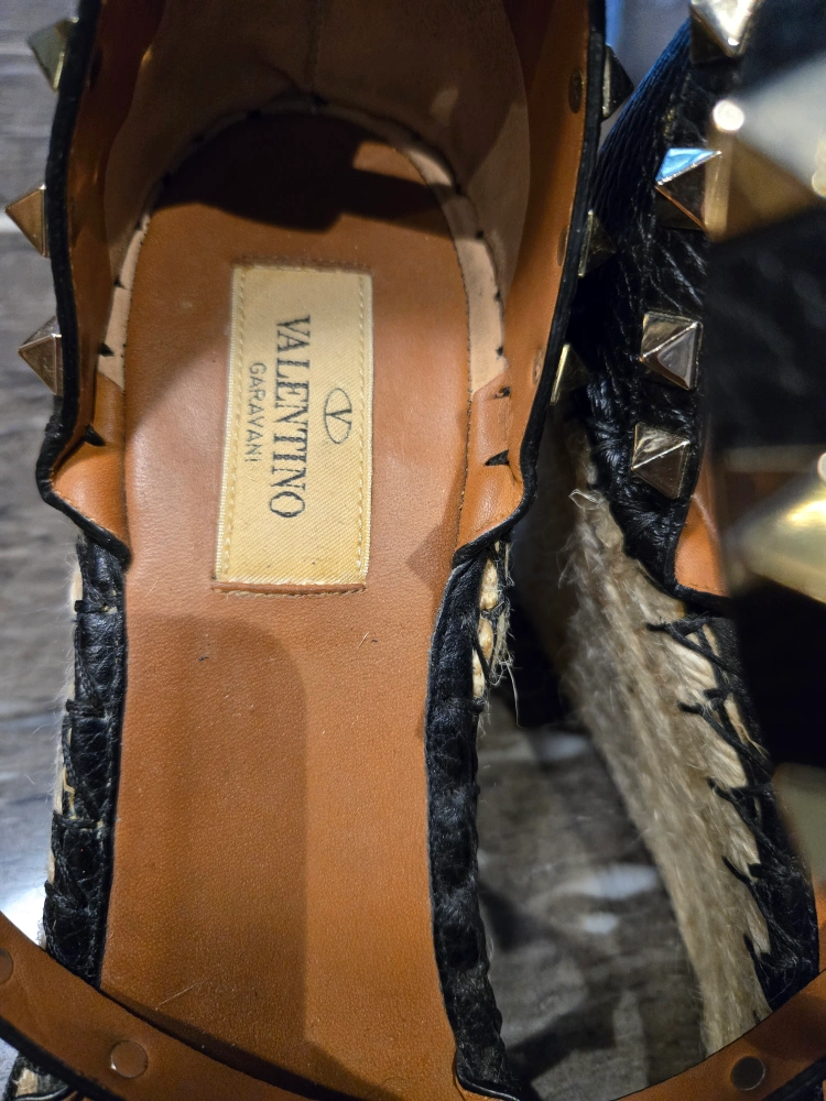 205These Valentino Garavani espadrille sandals feature a stylish design with studded detailing. They are in good condition and perfect for adding a touch of elegance to your outfit. The sandals feature a black leather upper and a comfortable espadrille sole.