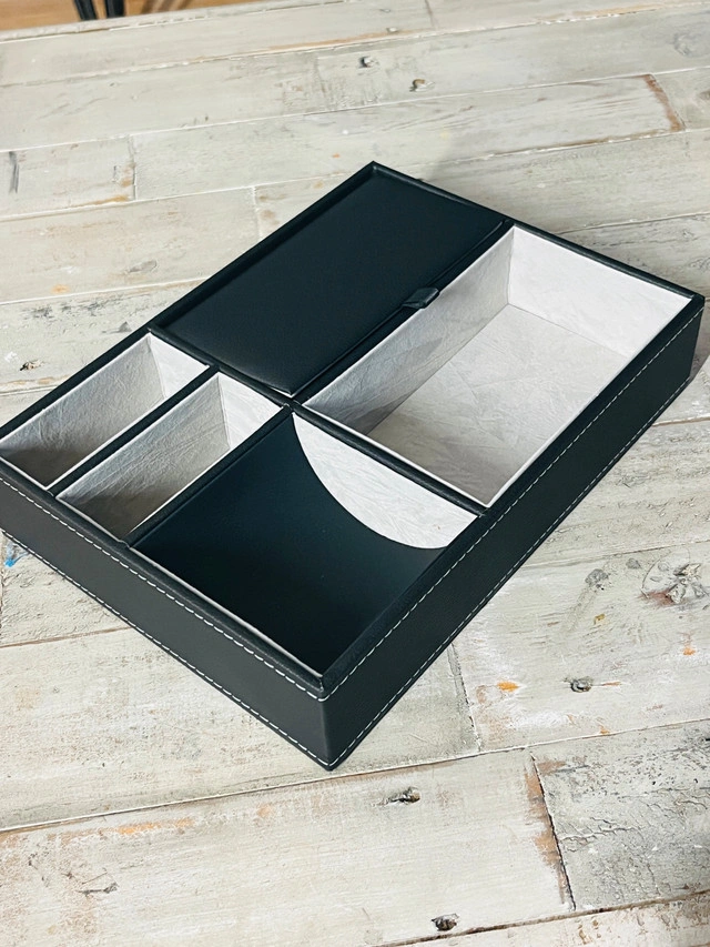 This valet tray is brand new, comfortable touching and strong. External surface is classic black, and the interior is in light color making it more convenient to find the needed items. This valet tray organizer features a single layer with 5 compartments design which is more convenient to organize different items. Different styles compartments meets different storage needs. With different styles compartments, it will be easy to organize various items and make the nightstand and countertop tidy. 2 slim compartments are suitable for holding phone, remote control and wallet; curved section compartment for easier grip bracelets, watch and more. Compartments with lids can protect individual valuable items and prevent them from dust. This valet tray organizer is suitable for men and women to store bedside table essentials such as razors, tweezers, nail clippers, jewelry, perfumes, cosmetics, stationery, and more. The valet tray organizer can be placed in bathroom, bedroom, office, dorm and more. A perfect gift for friends, family, colleagues on Christmas, birthdays, etc. This valet tray organizer is decent and elegant on the countertop and nightstand which can be a beautiful decoration. Perfect for entryway, bedside table, dresser, desktop. Pickup is available in Brampton near Sheridan College.