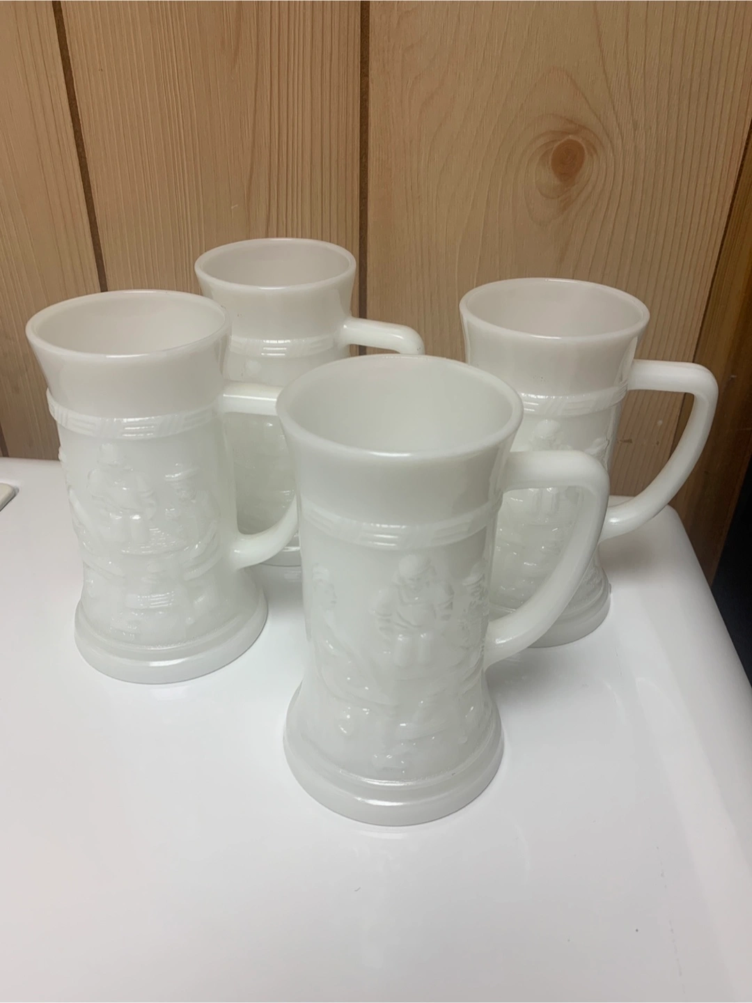 Selling a set of 4 Federal Milk Glass Iridescent Tankard Beer Stein Mugs with Tavern Scene.